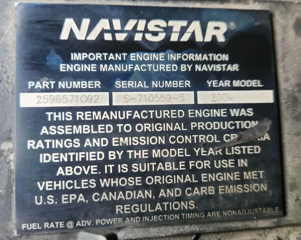 (Core) 2004 International DT466, ENGINE ASSEMBLY- Remanufactured BY NAVISTAR, Displacement: 7.6L, Horsepower: 245, Serial Number: S-710559-5, Part Number: 2596571C92, Reference images for condition,
