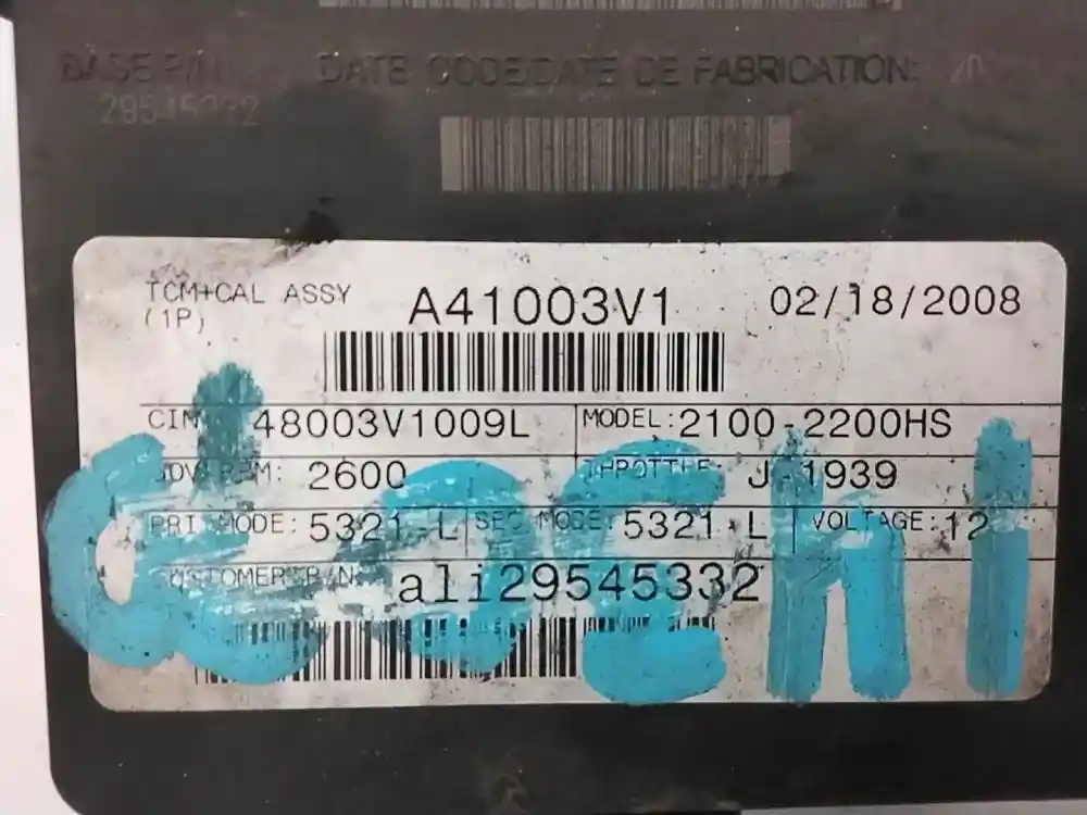 (Core) 2008 Allison (AT), TRANSMISSION ECM- ECM Model: 2100-2200HS Part Number: A41003V1 Serial Number: BK5322N173487RMT Transmission Model: 1000HS, CIN: 48003V1009L PRI MMODE: 5321-L THROTTLE J-1939 VOLTAGE: 12 CUSTOMER P/N ALI 29545332 Plug Pins: 80 Pins Plug Rectangular, Reference images for condition. ,