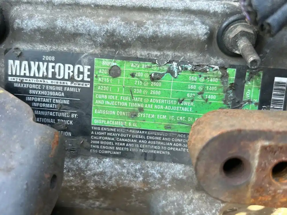 (Core) 2008 International MAXXFORCE 7, ENGINE ASSEMBLY- Family Number: 8NVXH03890AGA, Displacement: 6.4L Horsepower: 200, Serial Number: 1882242C1, E.C.S.: ECM, TC, CAC, DI, EGR, OC, PTOX, It’s missing valve cover, Reference images for condition