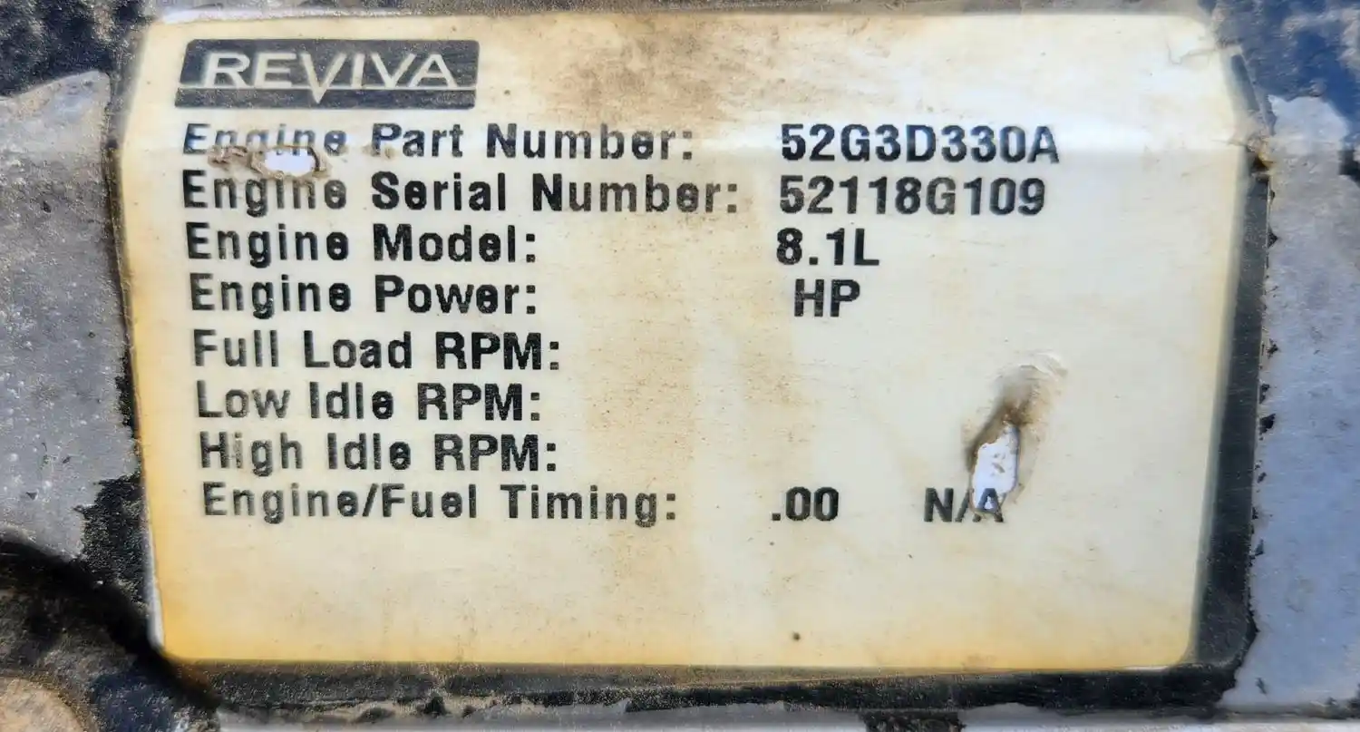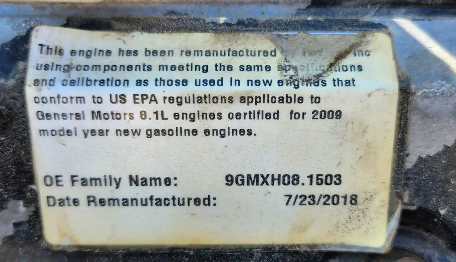 (Core) 2009 GM/Chev (HD) 8.1L, ENGINE ASSEMBLY- Remanufactured REVIVA- Date Remanufactured: 7/23/2018, Family Number: 9GMXH08.1503, Displacement: 8.1L, Horsepower: 330, ESN: 52118G109 Part Number 52G3D330A,