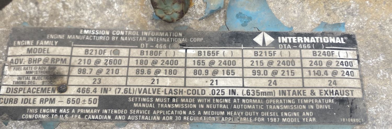 (Used) 1987 INTERNATIONAL DT466 ENGINE ASSEMBLY, Horsepower: 210, Displacement: 7.6L, Serial Number: 468TM2U505817, Part Number: DT466