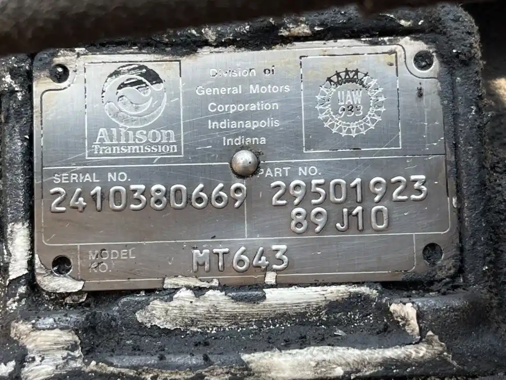 (Used) 1989 Allison (AT), TRANSMISSION ASSEMBLY- Model: MT643, Serial Number: 2410380669, Part Number: 29501923, Engine: International DT466, Reference images for condition, ,