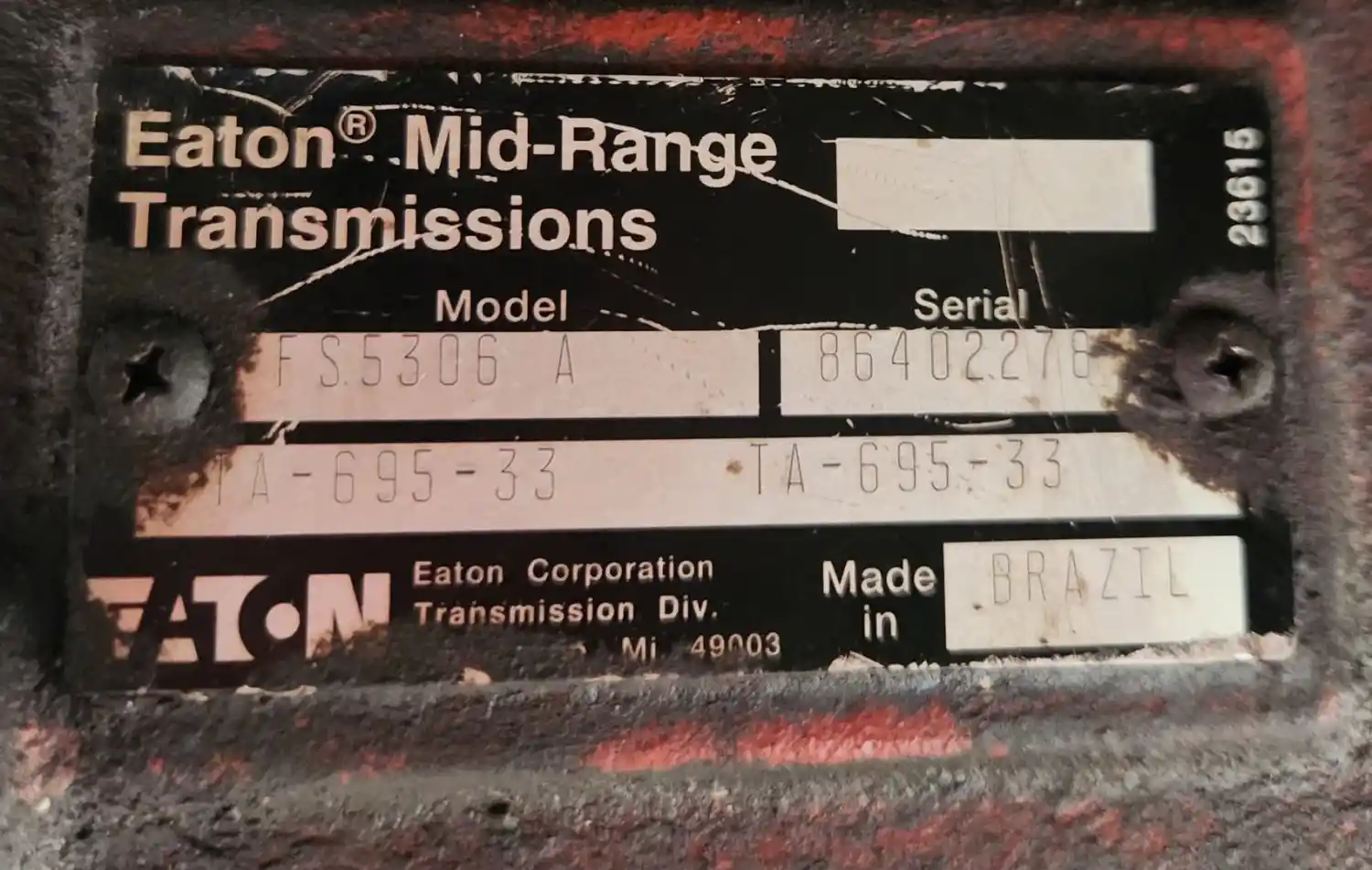(Used) 1991 Eaton/Fuller (MT), TRANSMISSION ASSEMBLY- Model: FS5306A, Serial Number: 86402278, Part Number: TA-695-33, Engine: Ford 170,