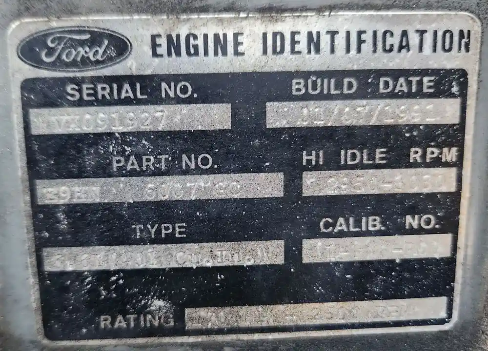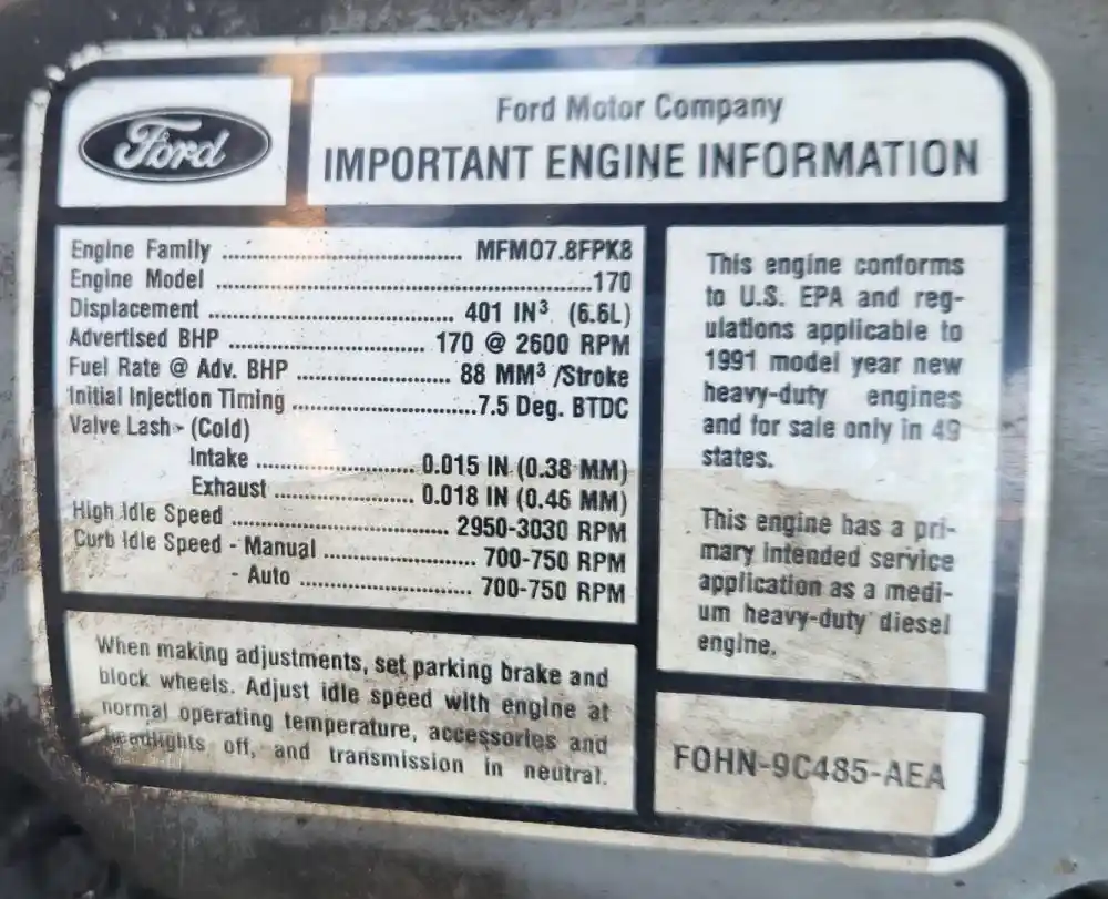 (Used) 1991 Ford 170, ENGINE ASSEMBLY- Family Number: MFM07.8FPK8, Displacement: 6.6L, Horsepower: 170, Serial Number: VX091927, Part Number: E9HN-6007-GO,
