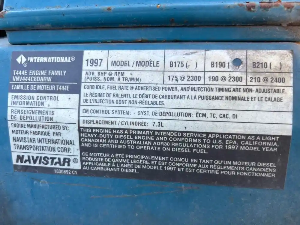 (Used) 1997 International T444E, ENGINE ASSEMBLY- Remanufactured by Navistar Family Number: VNV444C8DARW, Displacement: 7.3L, Horsepower: 190 Serial Number: 1830892C1, E.C.S.: ECM, TC, CAC, DI, Reference images for condition For more information on this item, give us a call.