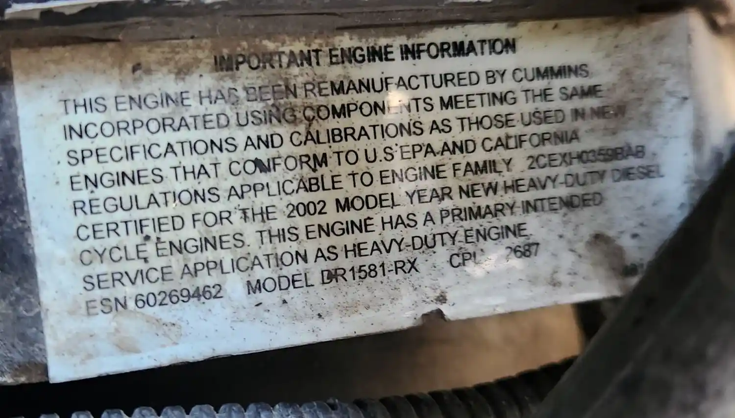 (Used) 2002 Cummins ISB 5.9, ENGINE ASSEMBLY- REMANUFACTURED- Family Number: 2CEXH0359BAB, Displacement: 5.9L, Horsepower: 185, Ar.No./CPL: 2687, Serial Number: 60269462, Reference images for condition