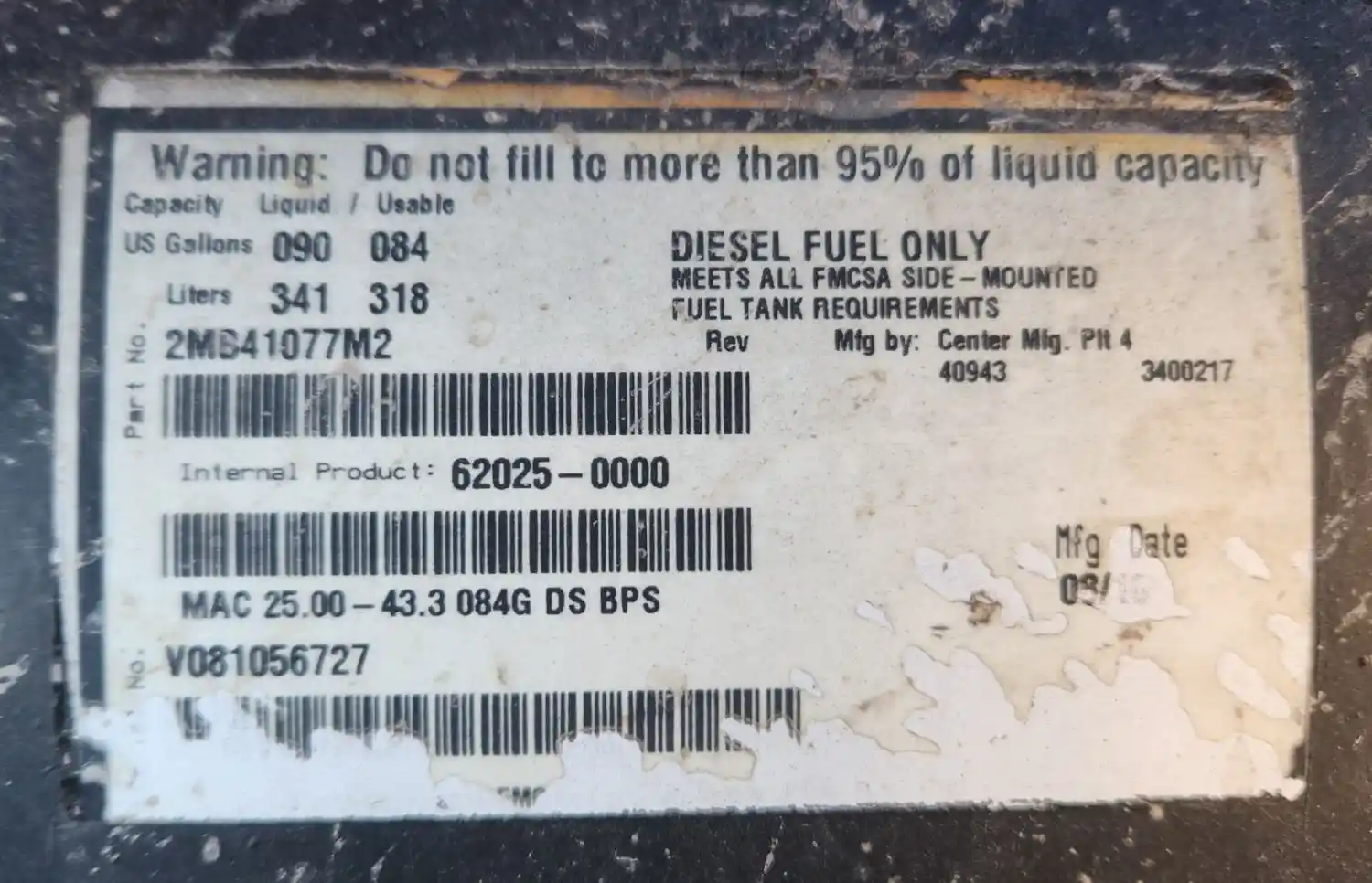 (Used) 2003 Mack CH613, FUEL TANK- Part Number: 2MB41077M2, Side: Driver Left Side, Capacity: 90 Gallons, Material: Steel, Shape: Round, Dimensions: L=42 ½", D=25", Reference images for condition,