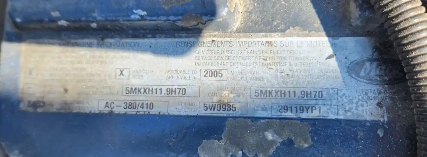 (Used) 2005 Mack AC-380/410, ENGINE ASSEMBLY- Family Number: 5MKXH11.9H70, Displacement: 11.9L, Horsepower: 380, Serial Number: 5W0985, E.C.S: EM, EC, TC, CAC, DI, SPL, CEGR,