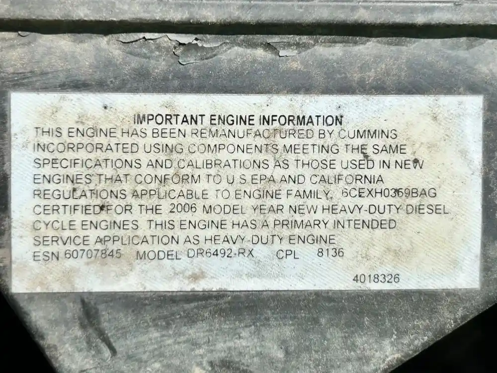 (Used) 2006 Cummins ISB 5.9, ENGINE ASSEMBLY- REMANUFACTURED- Family Number: 6CEXH0359BAG, Displacement: 5.9L, Horsepower: 185, Ar.No./CPL: 8136, Serial Number: 60707845, Reference images for condition