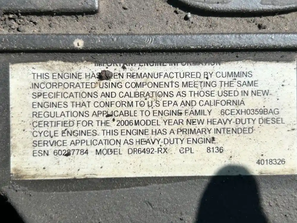 (Used) 2006 Cummins ISB 5.9, ENGINE ASSEMBLY- REMANUFACTURED- Family Number: 6CEX0359BAG, Displacement: 5.9L, Horsepower: 185, Ar.No./CPL: 8136, Serial Number: 60287784, Reference images for condition