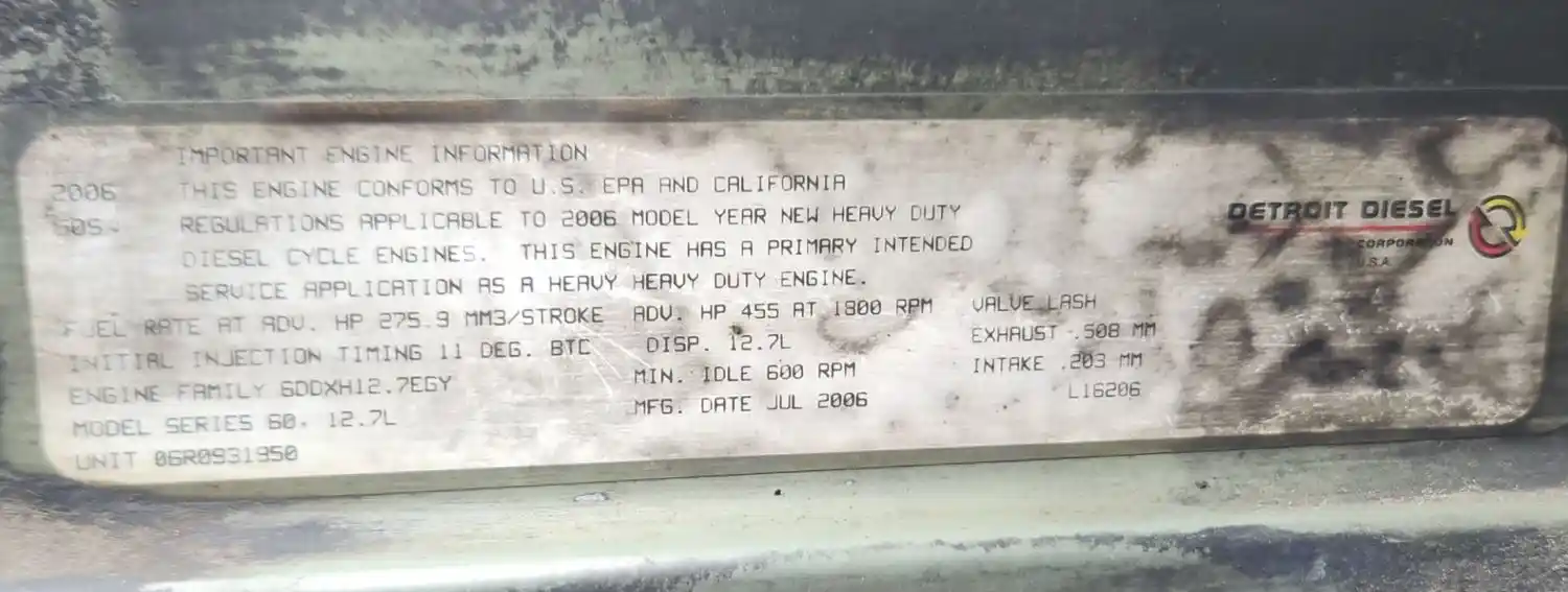 (Used) 2006 Detroit Series 60, ENGINE ASSEMBLY- Family Number: 6DDXH12.7EGY, Displacement: 12.7L, Horsepower: 455, Serial Number: 06R0931950,
