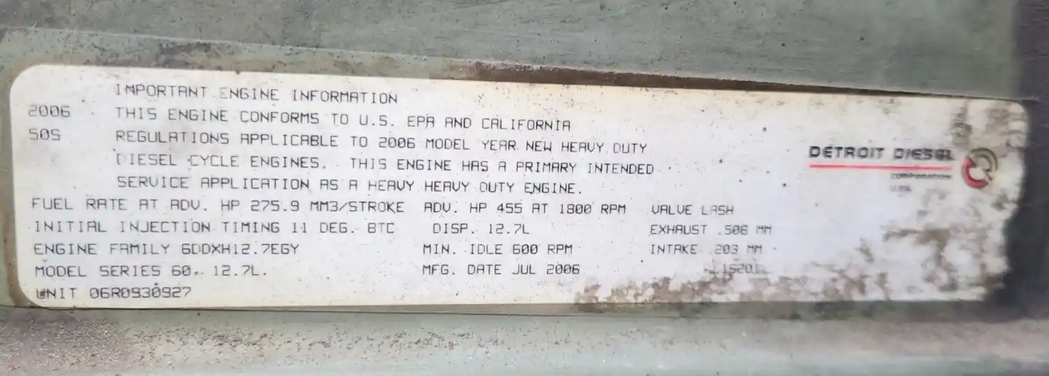 (Used) 2006 Detroit Series 60, ENGINE ASSEMBLY- Family Number: 6DDXH12.7EGY, Displacement: 12.7L, Horsepower: 455, Serial Number: 06R0930927,