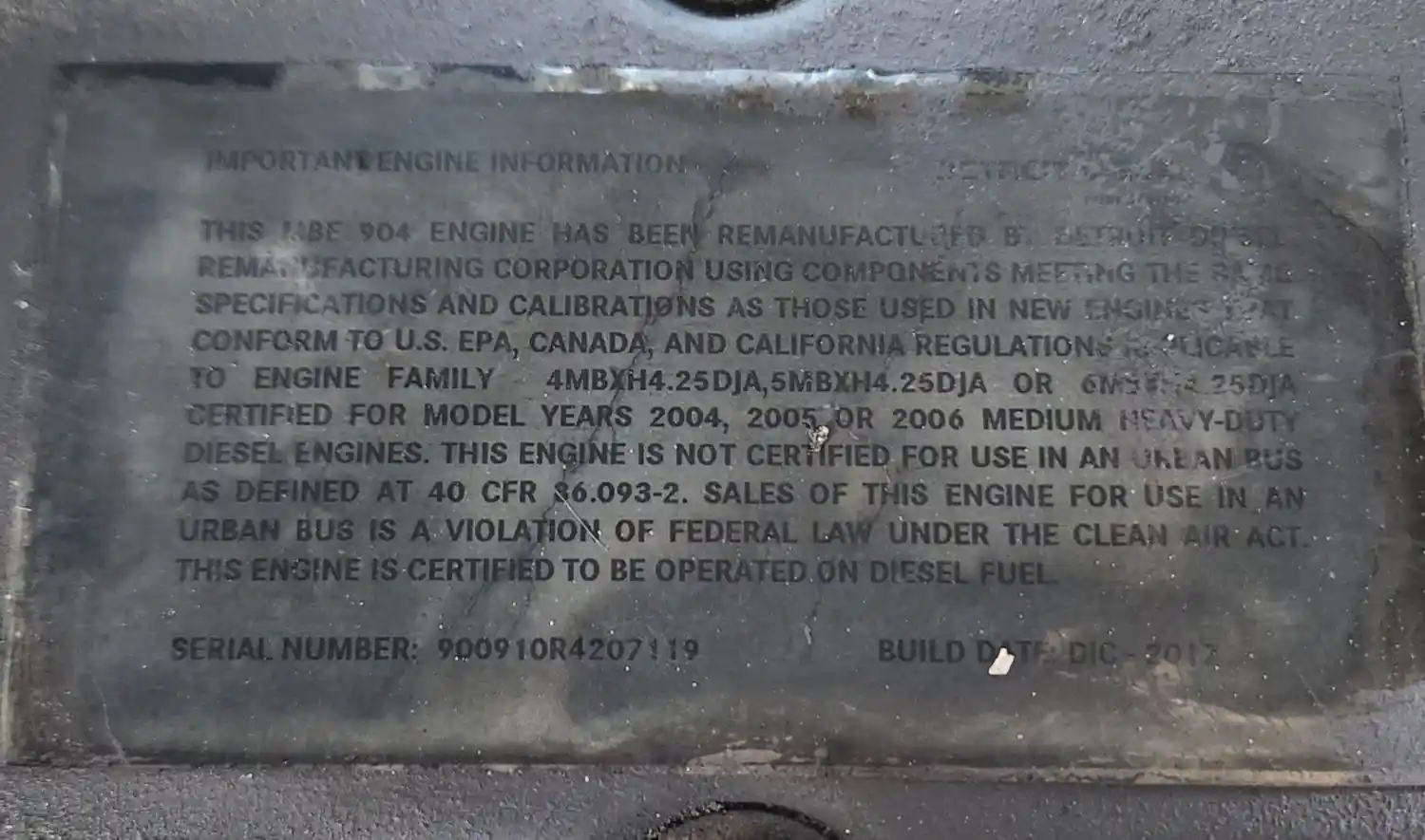 (Used) 2006 Mercedes MBE 904, ENGINE ASSEMBLY- REMANUFACTURED- Family Number: 6MBXH4.25DJA, Displacement: 4.3L, Horsepower: 175, Serial Number: 900910R4207119, Part Number: R23538871E, Reference images for condition