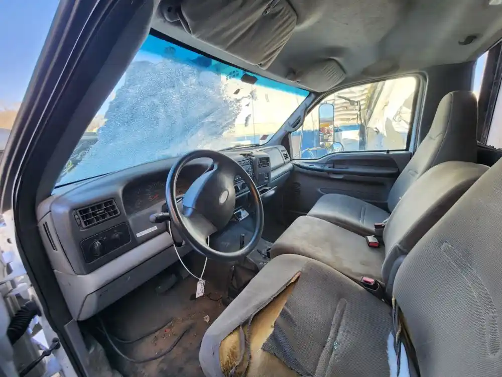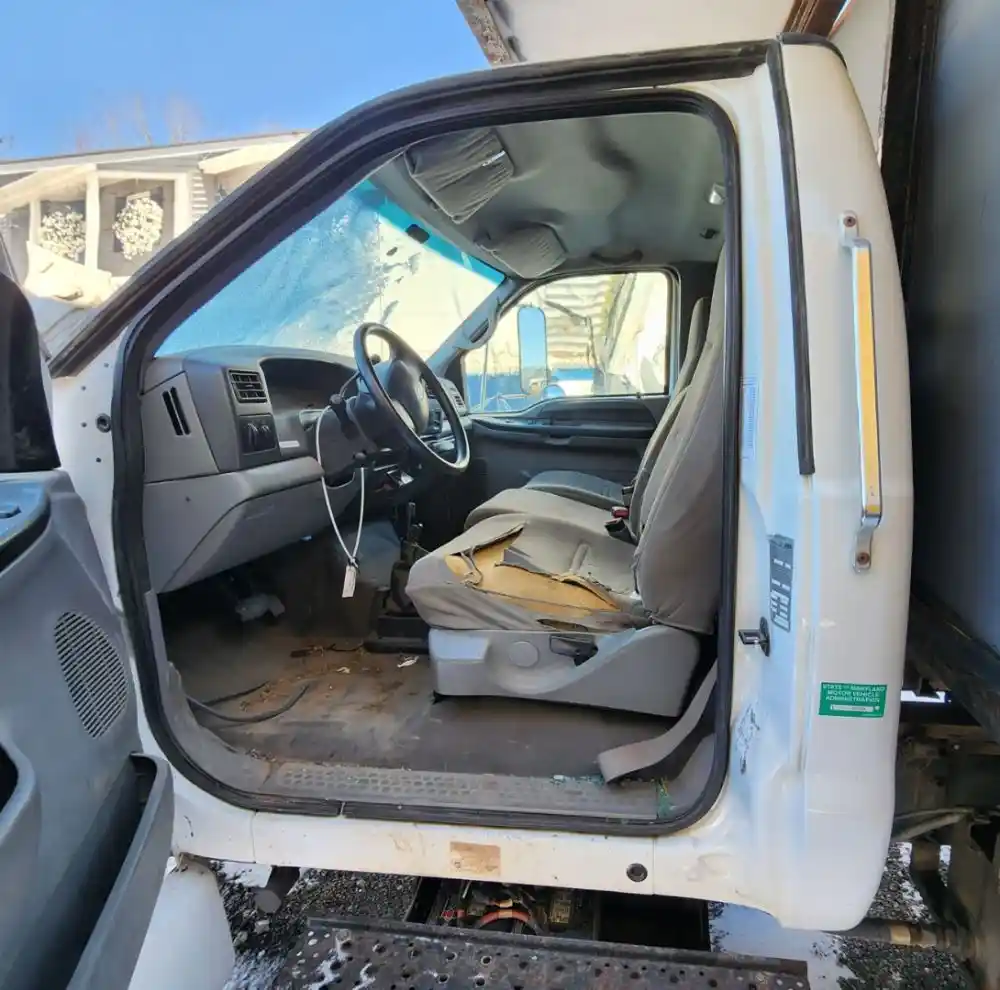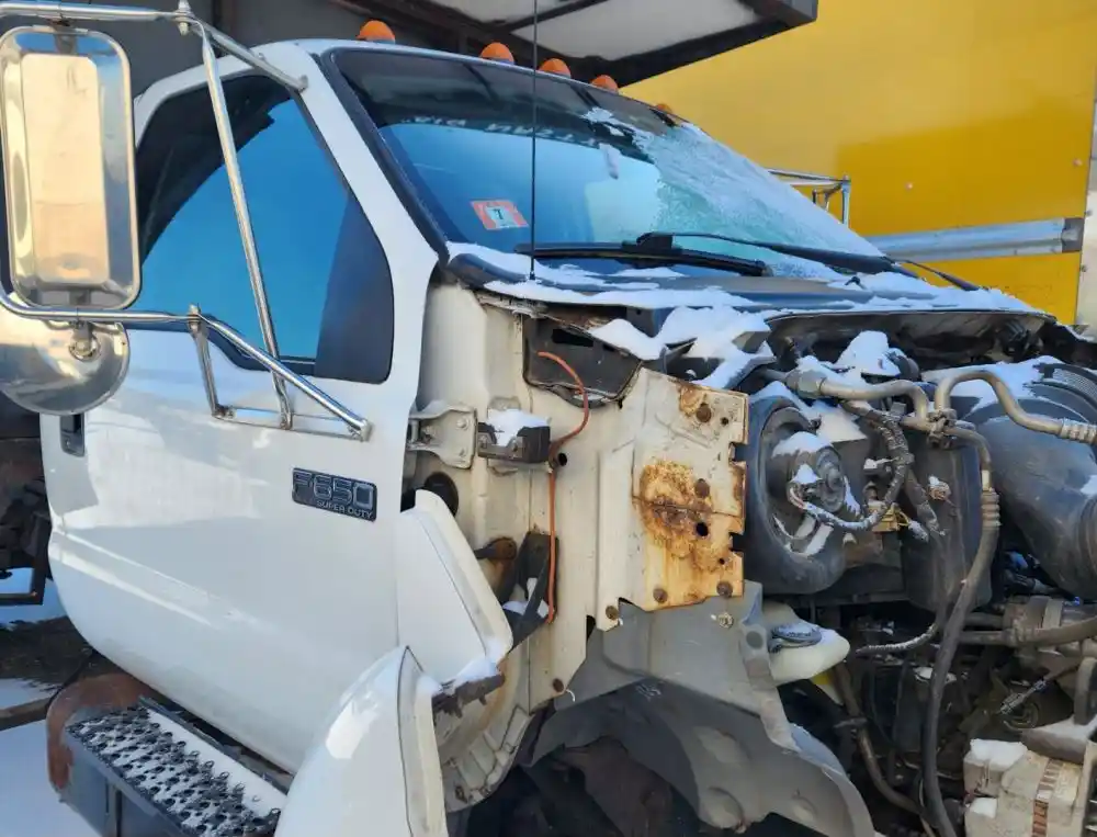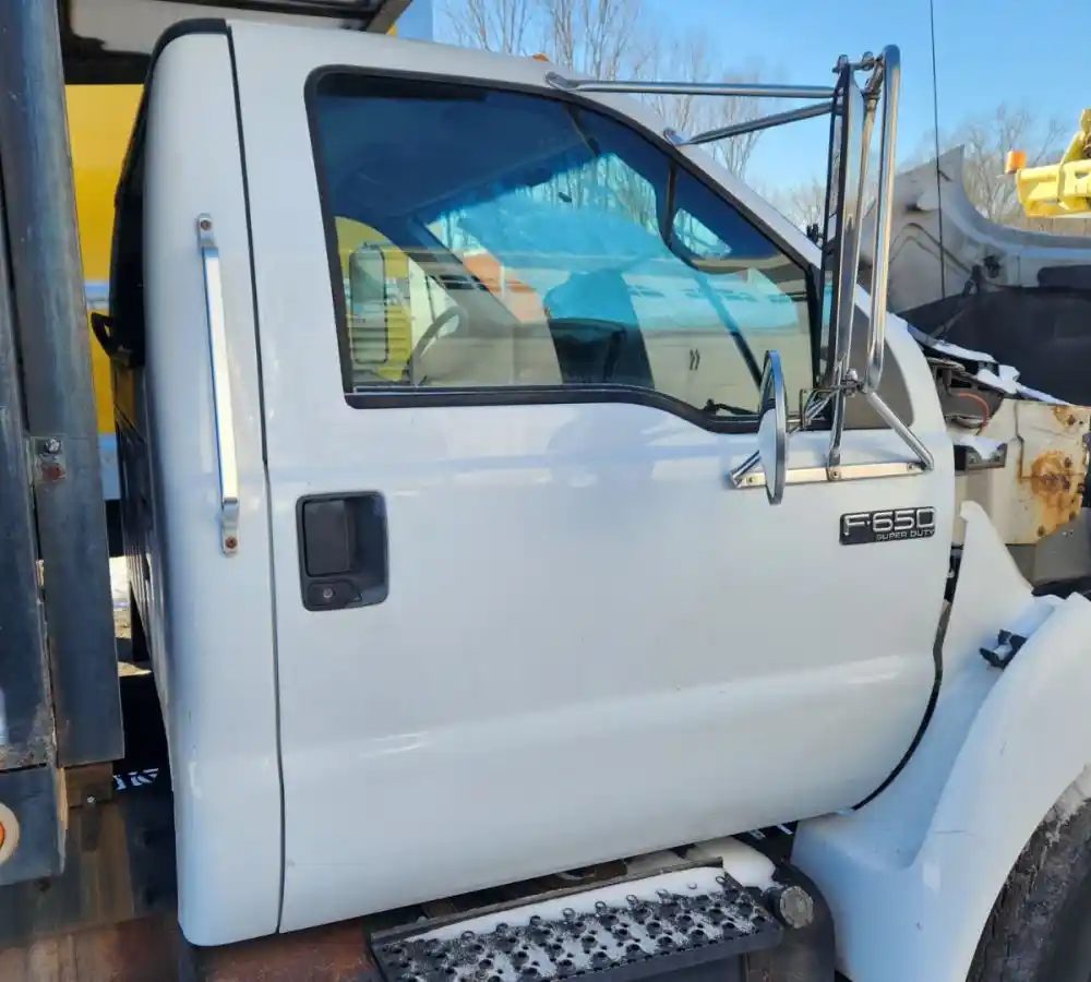 (Used) 2007 Ford F-650, CAB- Type: Day Cab, Engine: International A200, Color: White, Less Interior, Less Doors Sold Separately, Reference images for condition, It doesn't have a back window,