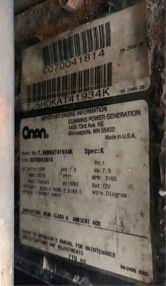 (Used) 2007 Freightliner Columbia 112, CUMMINS POWER GENERATOR- Make: Onan Commercial Mobile Power, Model: CMQD 7500, Engine Information- Serial Number: C070041814, Part Number: 99-2495-05, Make: Cummins, Model: 7.5HDKAT41934K, AC Volts: 120V, Amps: 62.5, KVA: 7.5, Pf: 1, Hz: 60HZ, PH: 1, KW: 7.5, RPM: 3160, Bat: 12V, Fuel: Diesel, Options: K020-2 R086-2 B183-2, SPEC-K 7-5HDKAT HDKAT, Reference images for condition,