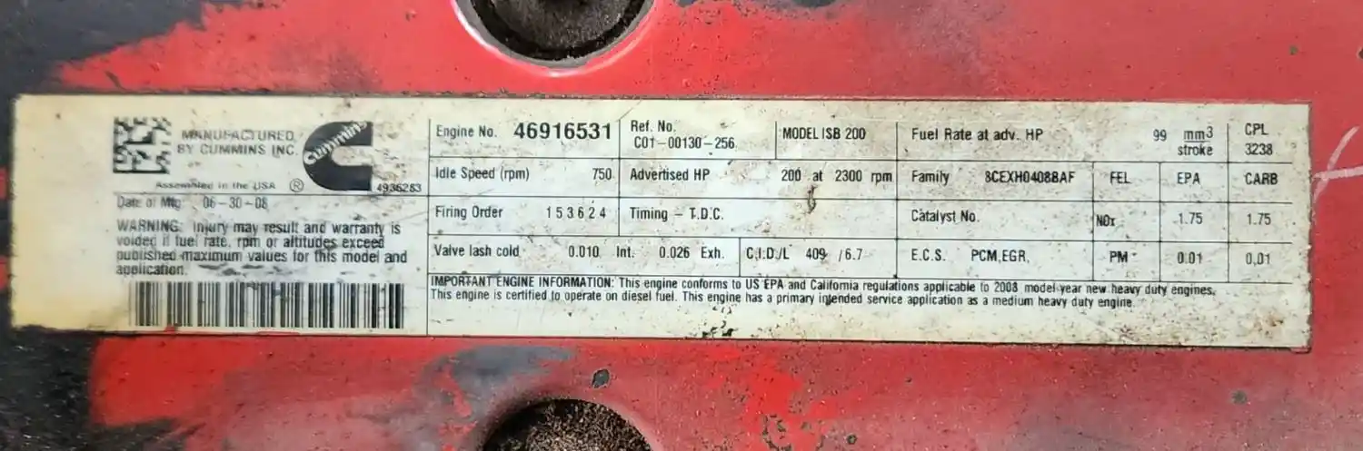 (Used) 2008 Cummins ISB 6.7, ENGINE ASSEMBLY- Family Number: 8CEXH0408BAF, Displacement: 6.7L, Horsepower: 200, Ar.No./CPL: 3238, Serial Number: 46916531, Part Number: C01-00130-256, E.C.S: PCM, EGR, Reference images for condition