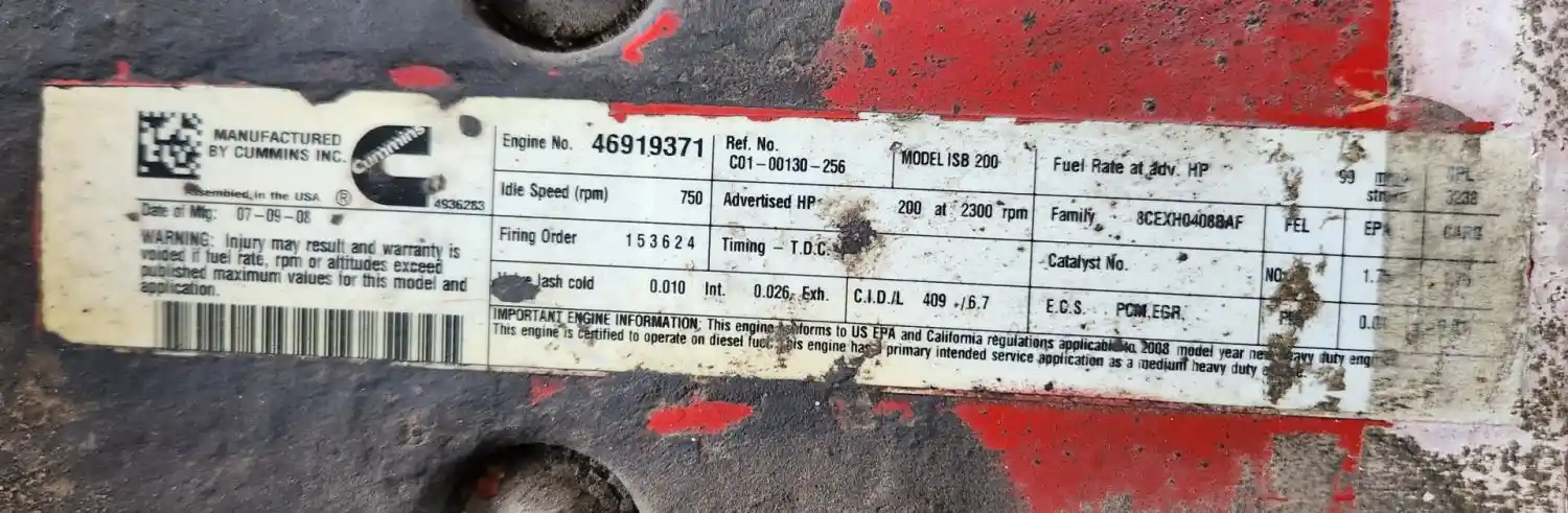 (Used) 2008 Cummins ISB 6.7, ENGINE ASSEMBLY- Family Number: 8CEXH0408BAF, Displacement: 6.7L, Horsepower: 200, Ar.No./CPL: 3238, Serial Number: 46919371, Part Number: C01-00130-256, ECS: PCM, EGR,