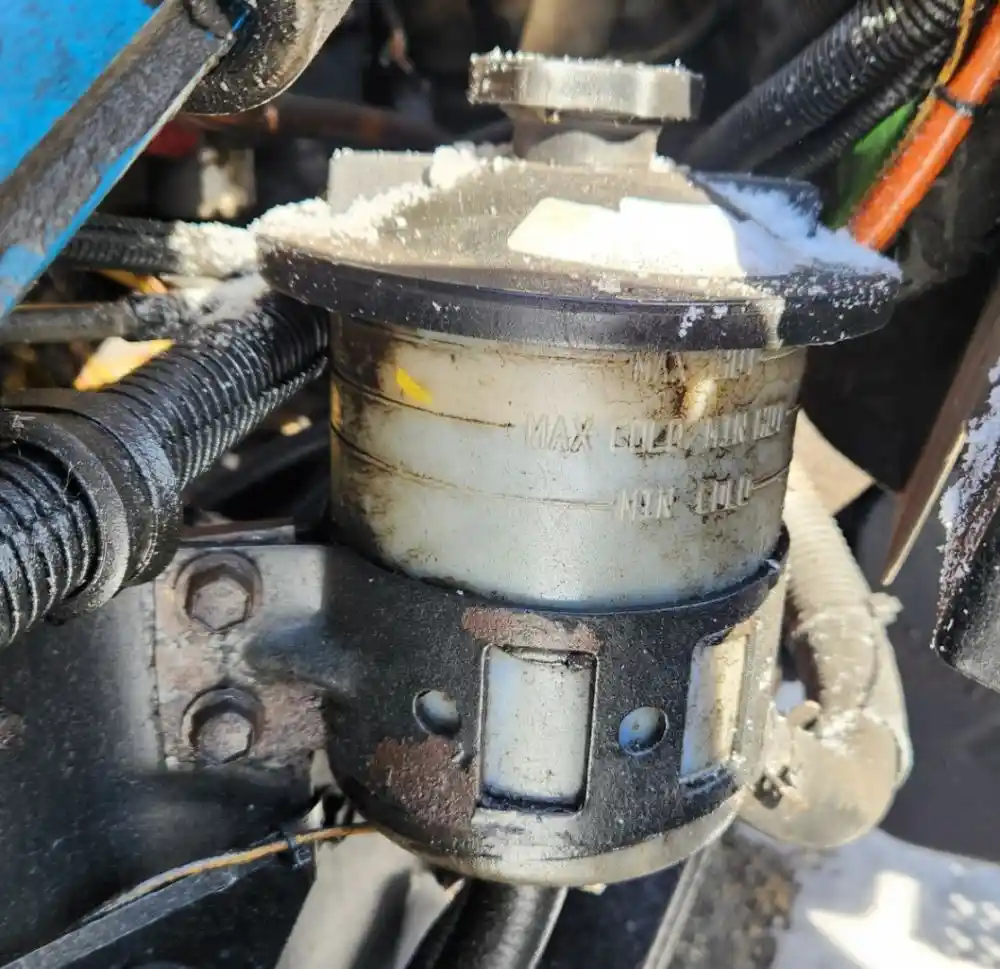 (Used) 2008 Ford F-750, POWER STEERING RESERVOIR- Location: Frame, Side: Driver Left Side, Engine: Caterpillar C7, Material: Plastic, Reference images for condition,
