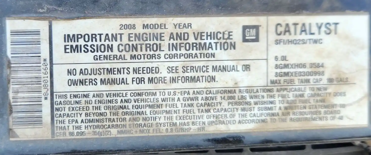 (Used) 2008 GM/Chev (HD) 6.0L, ENGINE ASSEMBLY- Family Number: 8GMXH06.0584, Displacement: 6.0L, Horsepower: 360, Serial Number: TBD, E.C.S: SFI, HO2S, TWC, Fuel: Gasoline,