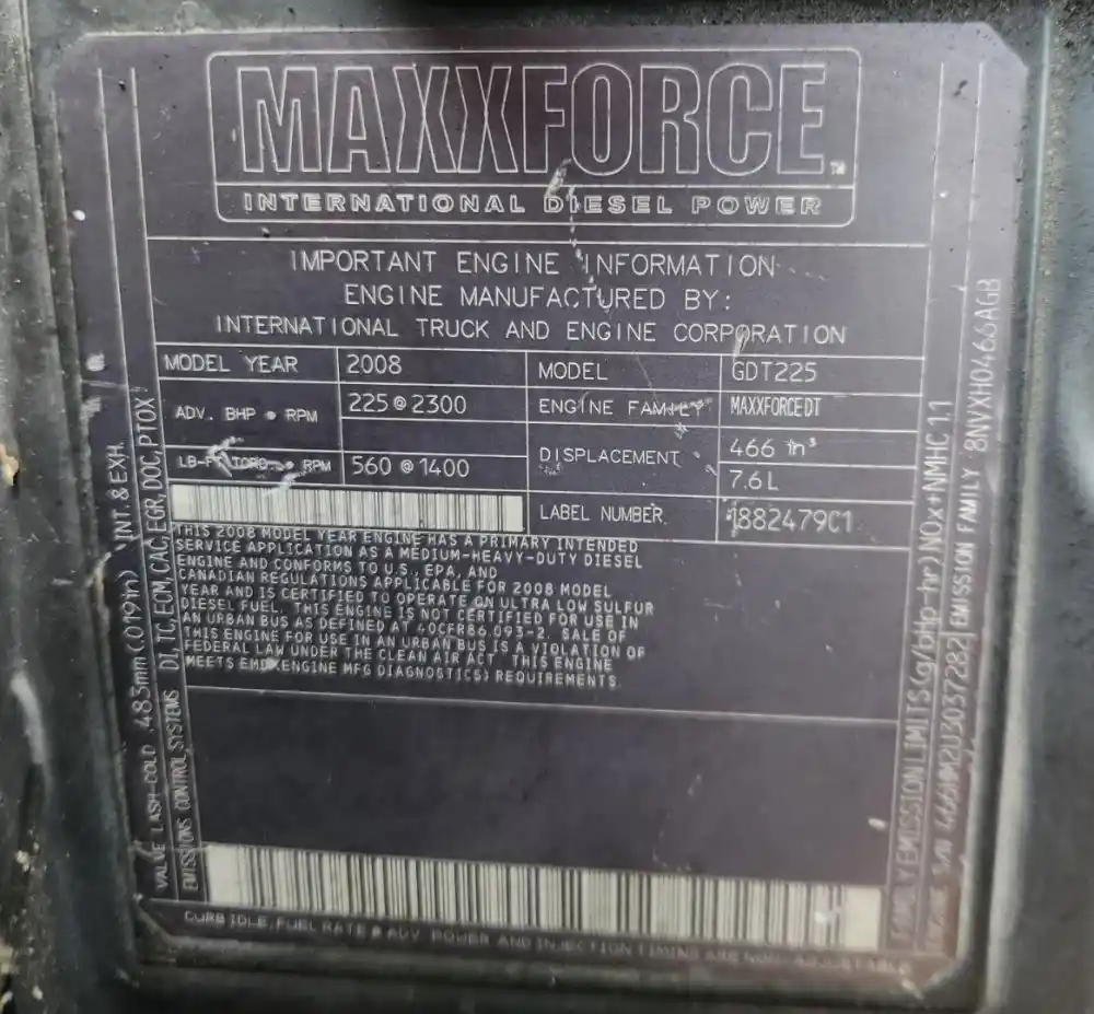 (Used) 2008 International GDT225, ENGINE ASSEMBLY- Family Number: MAXXFORCEDT, Displacement: 7.6L, Horsepower: 225, Serial Number: 466HM2U3037282, Part Number: 1882479C1, ECS: DI, TC, ECM, CAC, EGR, DOC, PTOX,