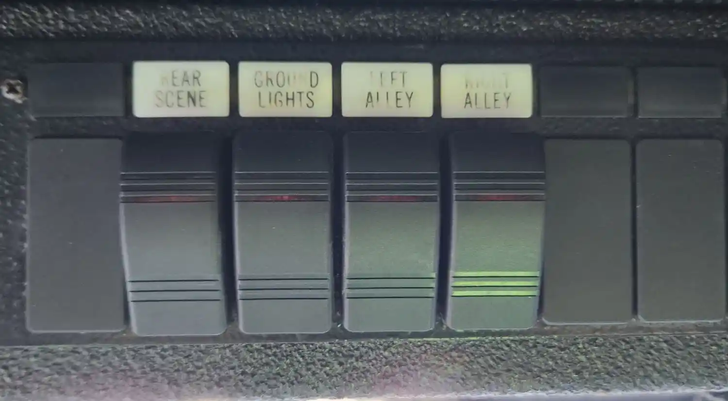 (Used) 2008 Seagrave Pumpers, MISCELLANEOUS DASH SWITCHES- Controls: Rear Scene, Ground Lights, Left Alley, Alarm Disable, Material: Aluminum with Plastic,