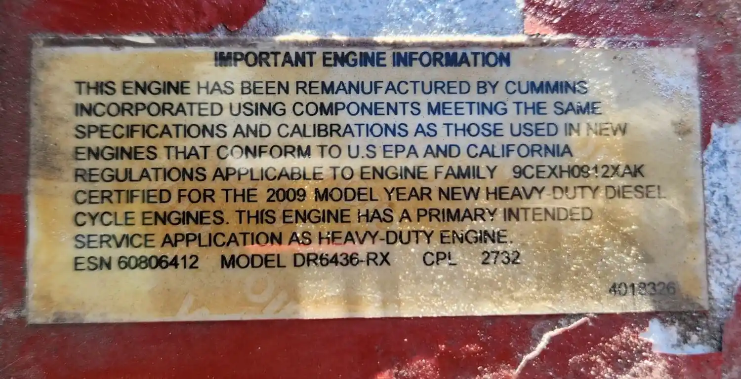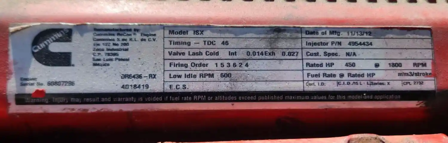 (Used) 2009 Cummins ISX, ENGINE ASSEMBLY, REMANUFACTURED- Family Number: 9CEXH0912XAK, Displacement: 15.0L, Horsepower: 450, Ar.No./CPL: 2732, Serial Number: 60806412,