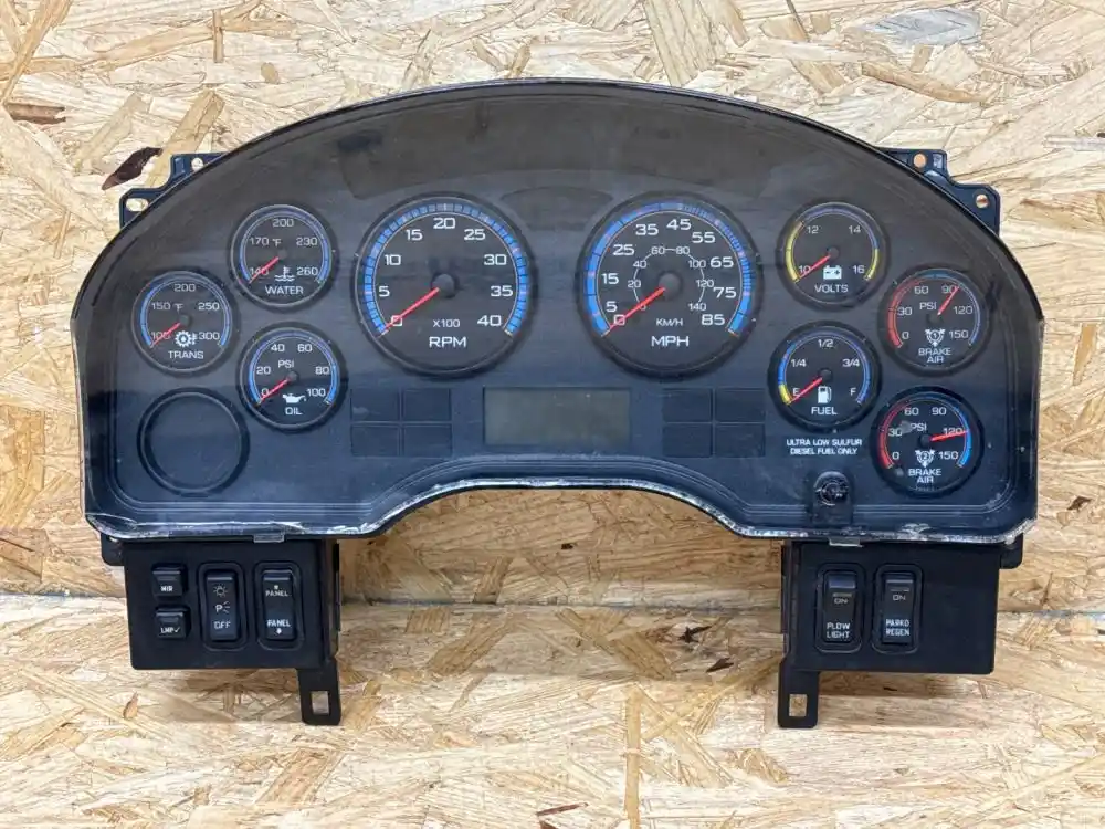 (Used) 2009 International 7400, INSTRUMENT CLUSTER- Gauges: Transmission Fluid Temperature, Water Temperature, Engine Oil Pressure, RPM, MPH, Battery Volts, Fuel Level, Brake Air Pressure (1), Brake Air Pressure (2), Damage see pictures, Reference images for condition