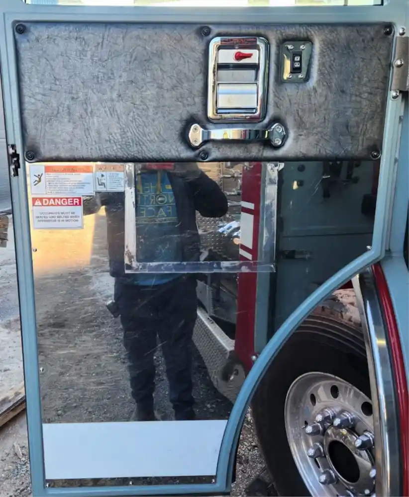 (Used) 2009 Pierce Custom Contender, INTERIOR DOOR PANEL- Side: Rear Driver Left Side, Color: Grey and Chrome, Type: Power, Material: Aluminum and Vinyl,
