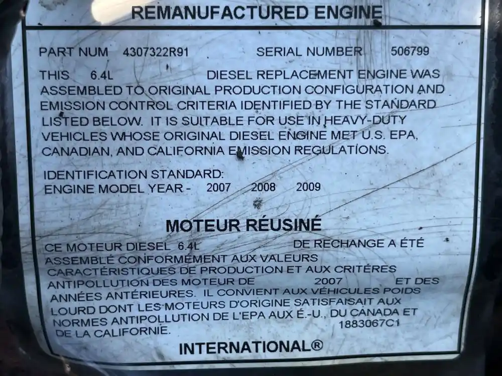 (Used) 2010 International MAXXFORCE 7, ENGINE ASSEMBLY- REMANUFACTURED- Displacement: 6.4L, Horsepower: 300, Serial Number: 506799, Part Number: 4307322R91,