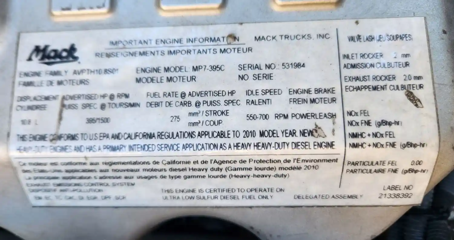 (Used) 2010 Mack MP7, ENGINE ASSEMBLY- Family Number: AVPTH10.8S01, Displacement: 10.8L, Horsepower: 395, Serial Number: 531984, ECS: EM, EC, TC, CAC, DI, EGR, DPF, SCR,