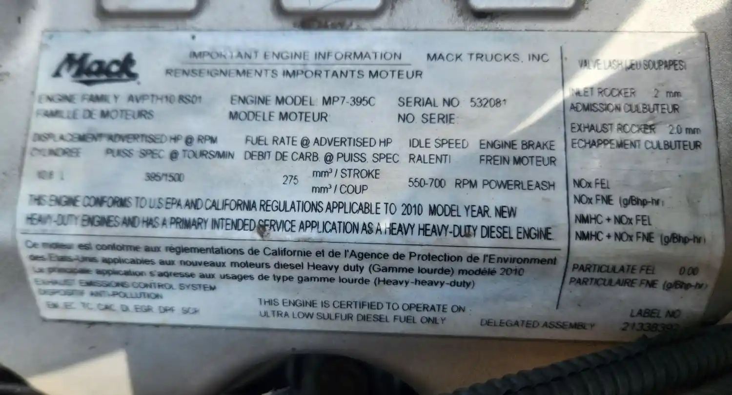 (Used) 2010 Mack MP7, ENGINE ASSEMBLY- Family Number: AVPTH10.8S01, Displacement: 10.8L, Horsepower: 395, Serial Number: 532081, ECS: EM, EC, TC, CAC, DI, EGR, DPF, SCR,
