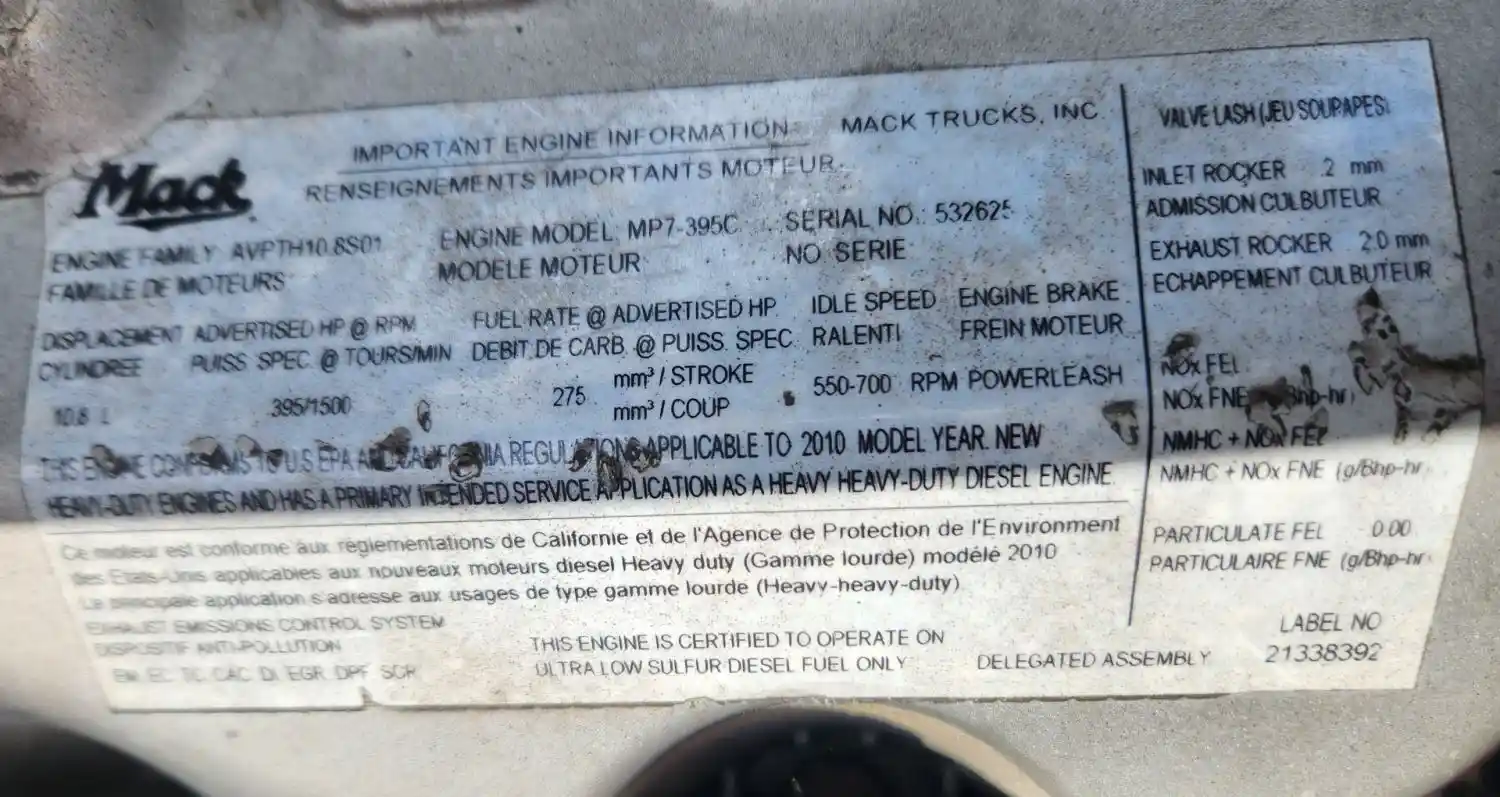 (Used) 2010 Mack MP7, ENGINE ASSEMBLY- Family Number: AVPTH10.8S01, Displacement: 10.8L, Horsepower: 395, Serial Number: 532625, ECS: EM, EC, TC, CAC, DI, EGR, DPF, SCR,