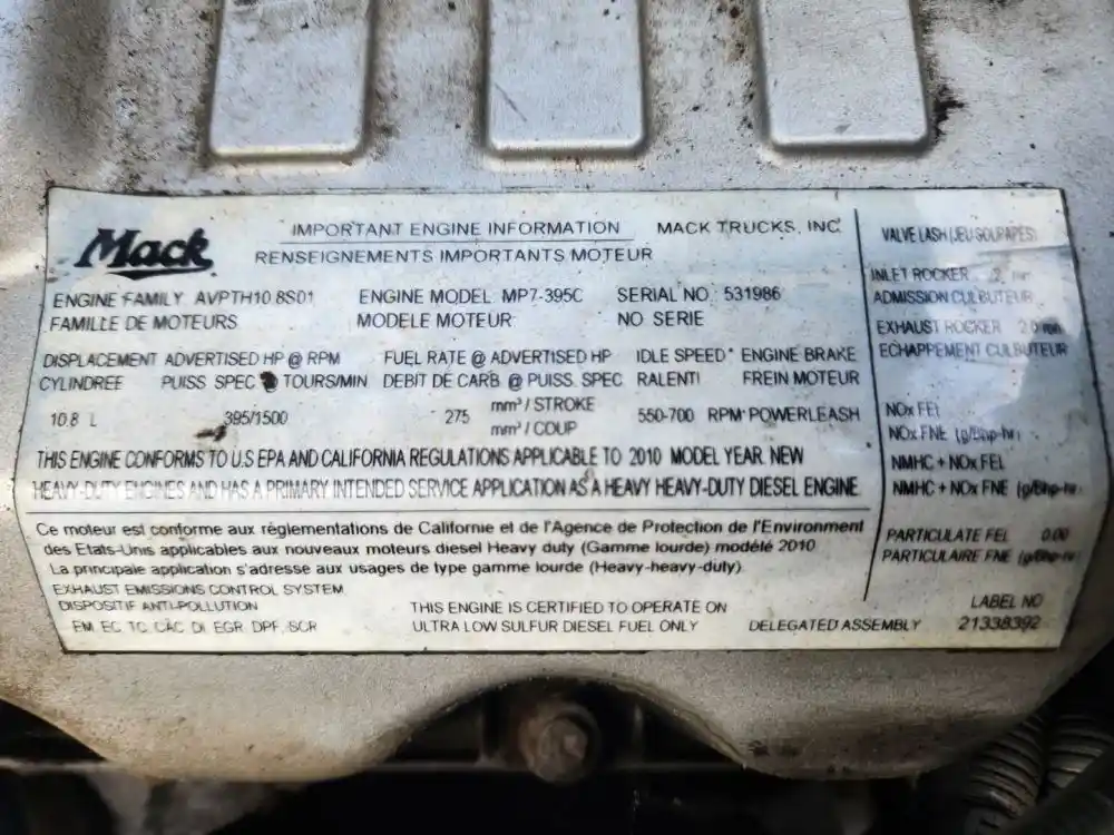 (Used) 2010 Mack MP7, ENGINE ASSEMBLY- Family Number: AVPTH10.8S01, Displacement: 10.8L, Horsepower: 395, Serial Number: 531986, ECS: EM, EC, TC, CAC, DI, EGR, DPF, SCR,
