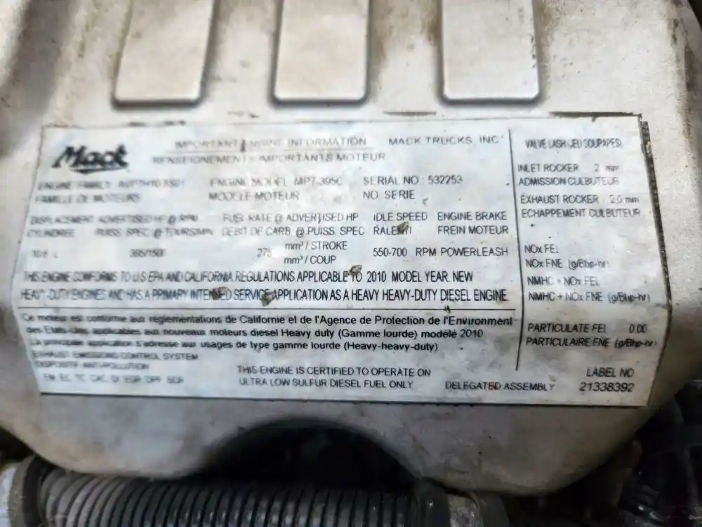 (Used) 2010 Mack MP7, ENGINE ASSEMBLY- Family Number: AVPTH10.8S01, Displacement: 10.8L, Horsepower: 395, Serial Number: 532253, ECS: EM, EC, TC, CAC, DI, EGR, DPF, SCR,