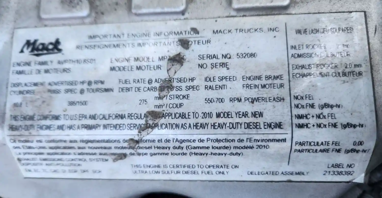 (Used) 2010 Mack MP7, ENGINE ASSEMBLY- Family Number: AVPTH10.8S01, Displacement: 10.8L, Horsepower: 395, Serial Number: 532080, ECS: EM, EC, TC, CAC, DI, EGR, DPF, SCR,
