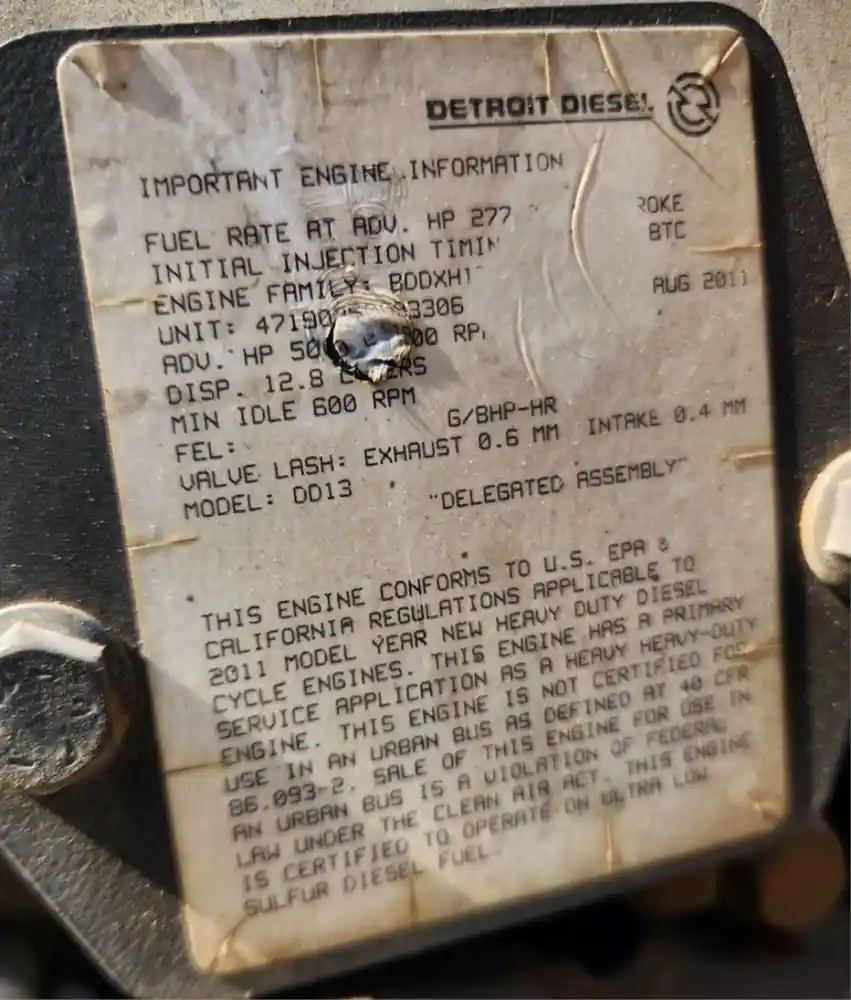 (Used) 2011 Detroit DD13, ENGINE ASSEMBLY- Family Number: BDDXH12.8FED, Displacement: 12.8L, Horsepower: 500, Serial Number: 471903S0093306,