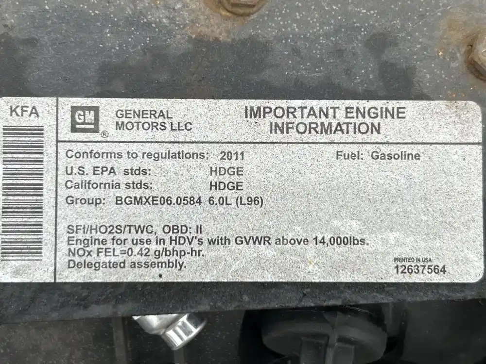 (Used) 2011 GM/Chev (HD) 6.0L, ENGINE ASSEMBLY- Family Number: BGMXE06.0584, Displacement: 6.0L, Horsepower: 360, Part Number: 12637564, E.C.S: SFI, HO2S, TWC, Reference images for condition