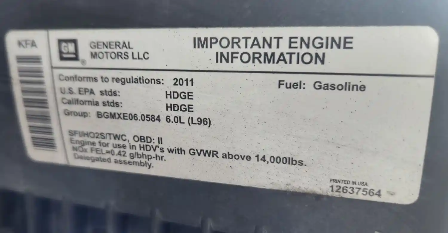 (Used) 2011 GM/Chev (HD) 6.0L, ENGINE ASSEMBLY- Family Number: BGMXE06.0584, Displacement: 6.0L, Horsepower: 360, Serial Number: TBD, E.C.S: SFI, HO2S, TWC, Fuel: Gasoline,