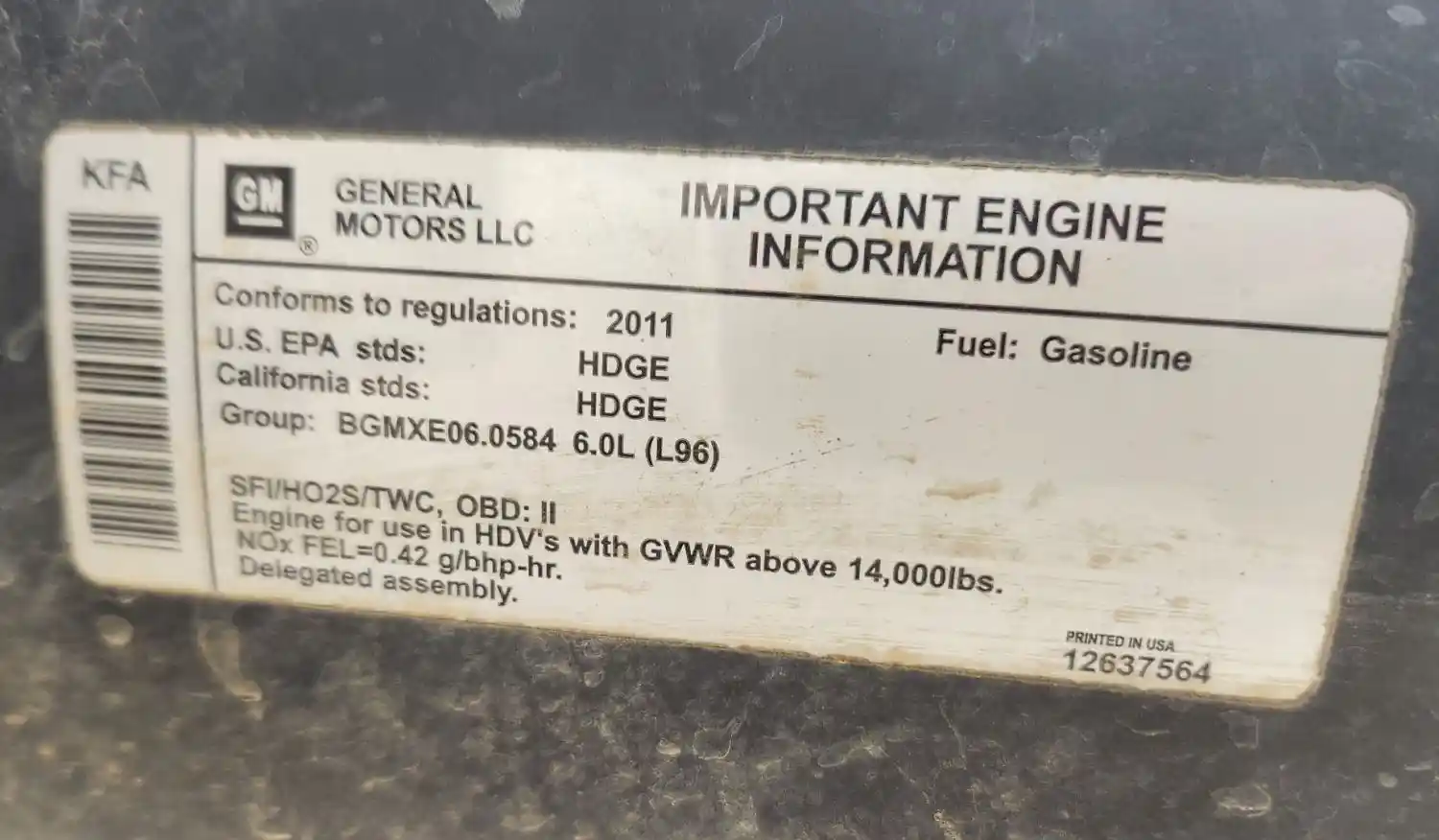 (Used) 2011 GM/Chev (HD) 6.0L, ENGINE ASSEMBLY- Family Number: BGMXE06.0584, Displacement: 6.0L, Horsepower: 360, Serial Number: TBD, E.C.S: SFI, HO2S, TWC, Reference images for condition