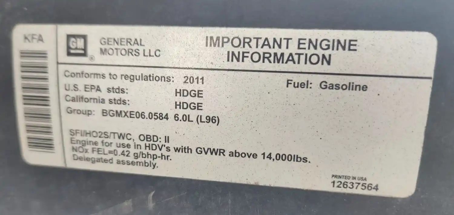 (Used) 2011 GM/Chev (HD) 6.0L, ENGINE ASSEMBLY- Family Number: BGMXE06.0584, Displacement: 6.0L, Horsepower: 360, Serial Number: TBD, E.C.S: SFI, HO2S, TWC, Fuel: Gasoline, Reference images for condition