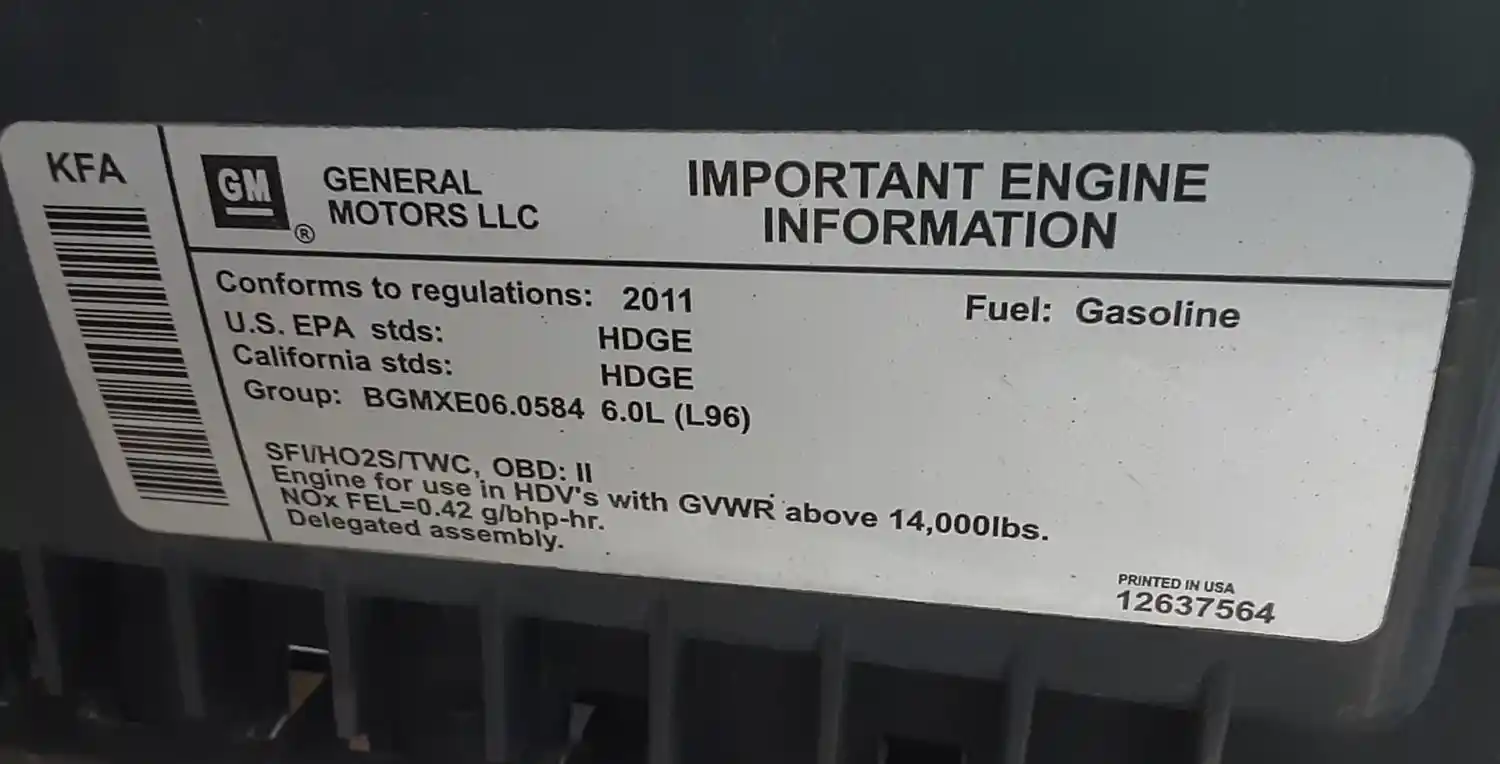 (Used) 2011 GM/Chev (HD) 6.0L, ENGINE ASSEMBLY- Family Number: BGMXE06.0584, Displacement: 6.0L, Horsepower: 360, Serial Number: TBD, ECS: SFI, HO2S, TWC, Fuel: Gasoline,