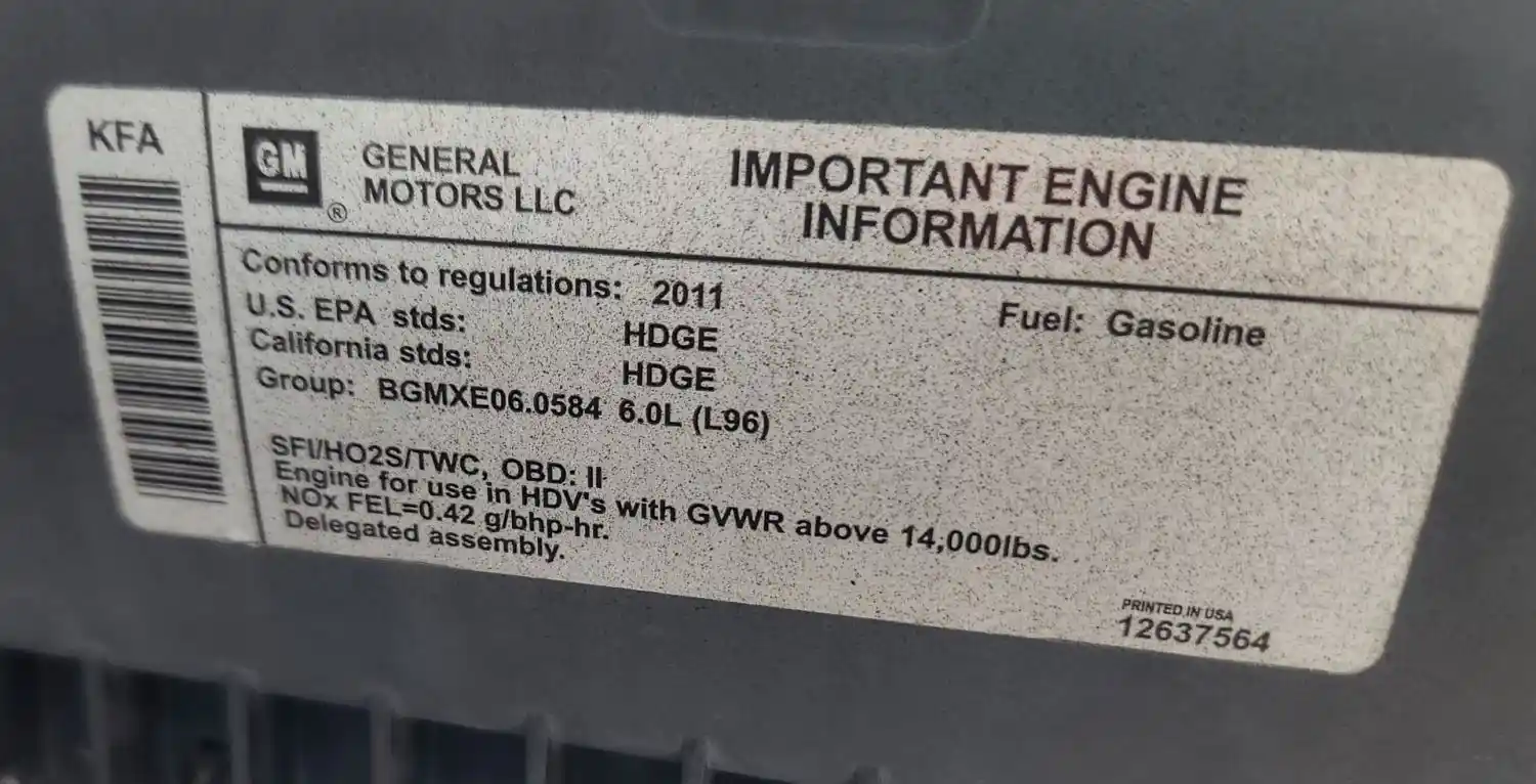 (Used) 2011 GM/Chev (HD) 6.0L, ENGINE ASSEMBLY- Family Number: BGMXE06.0584, Displacement: 6.0L, Horsepower: 360, Serial Number: TBD, E.C.S: SFI, HO2S, TWC, Fuel: Gasoline,
