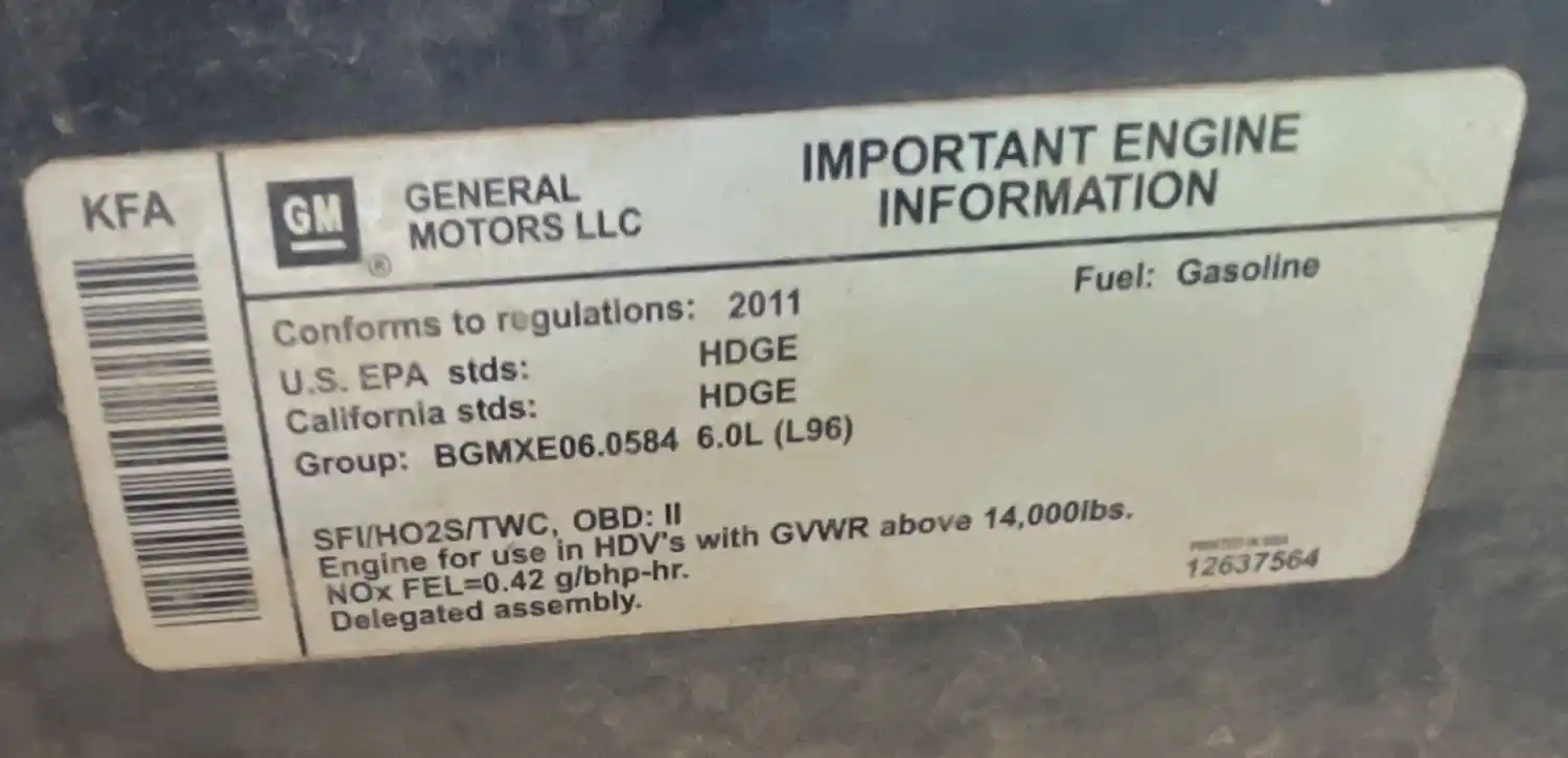 (Used) 2011 GM/Chev (HD) 6.0L, ENGINE ASSEMBLY- Family Number: BGMXE06.0584, Displacement: 6.0L, Horsepower: 360, Serial Number: TBD, ECS: SFI, HO2S, TWC, Fuel: Gasoline, Reference images for condition