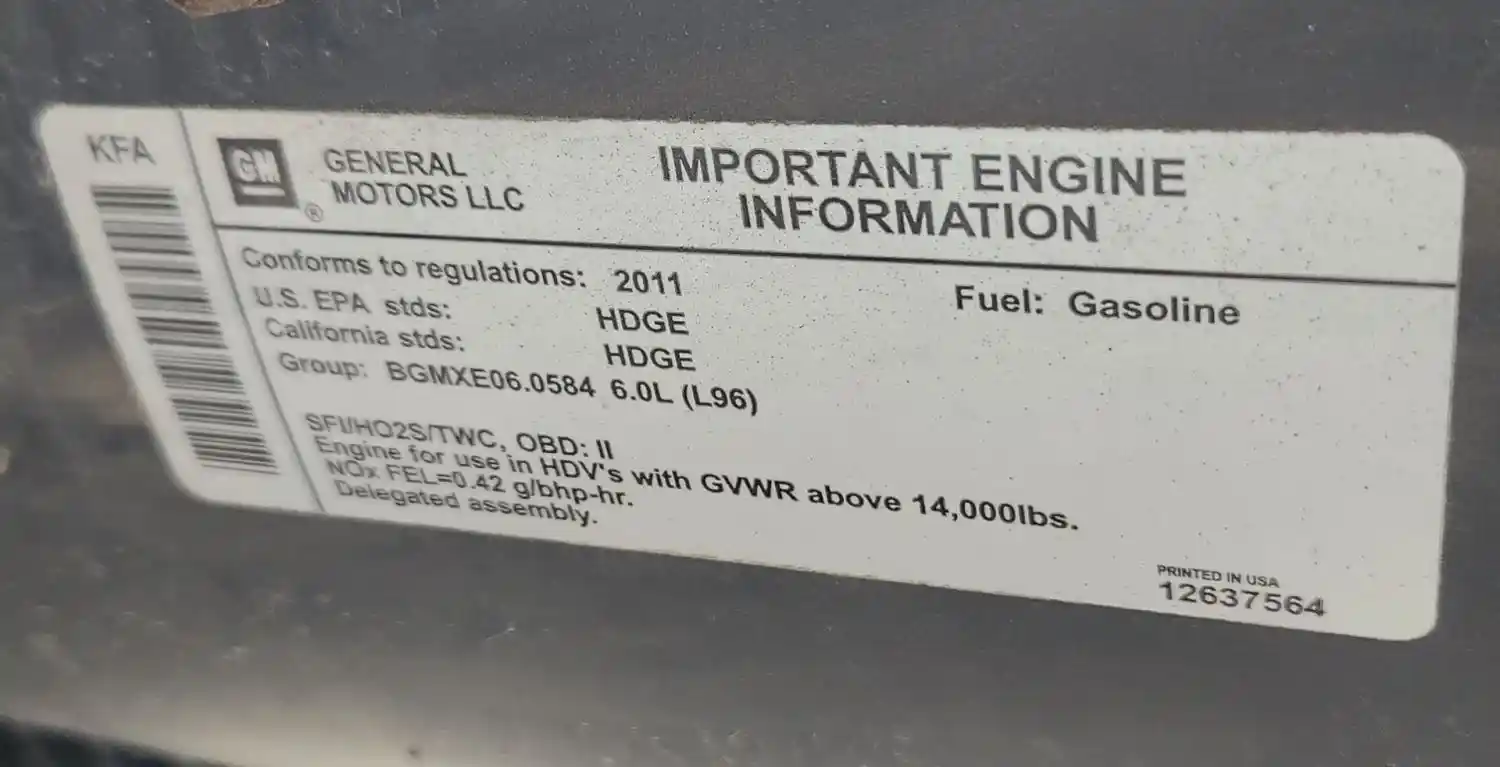 (Used) 2011 GM/Chev (HD) 6.0L, ENGINE ASSEMBLY- Family Number: BGMXE06.0584, Displacement: 6.0L, Horsepower: 360, Serial Number: TBD, ECS: SFI, HO2S, TWC, Fuel: Gasoline, Reference images for condition