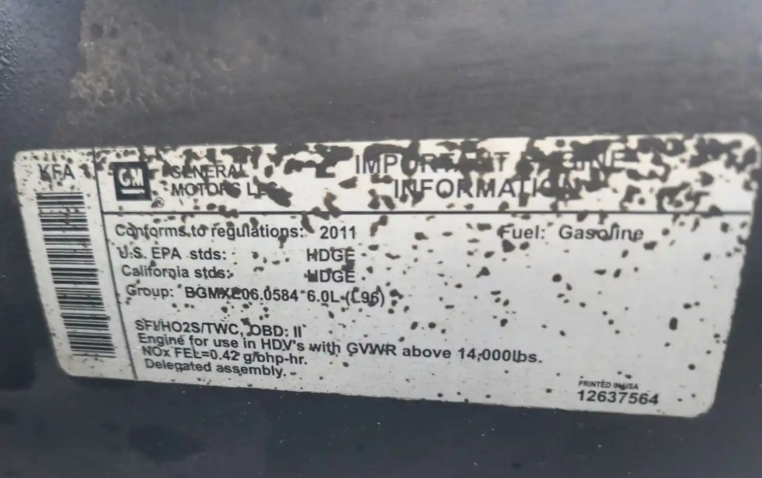 (Used) 2011 GM/Chev (HD) 6.0L, ENGINE ASSEMBLY- Family Number: BGMXE06.0584, Displacement: 6.0L, Horsepower: 360, Serial Number: TBD, ECS: SFI, H02S, TWC, Fuel: Gasoline, Reference images for condition