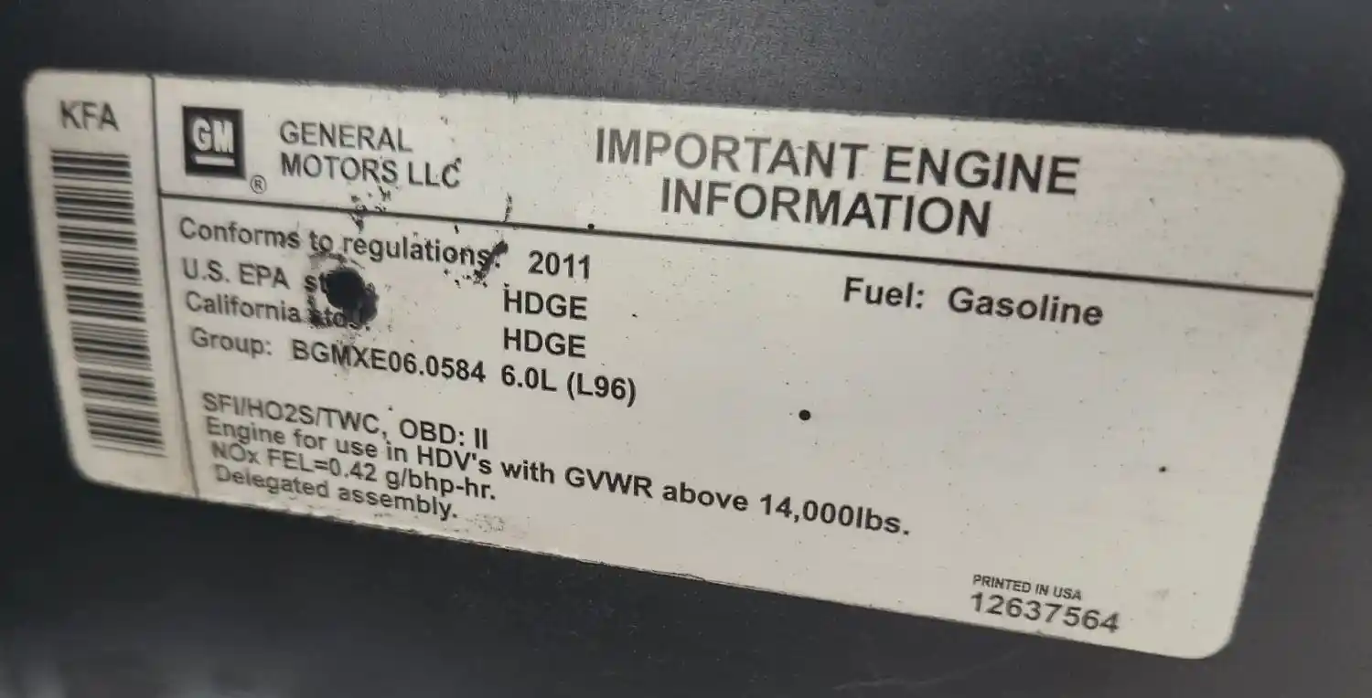 (Used) 2011 GM/Chev (HD) 6.0L, ENGINE ASSEMBLY- (REMANUFACTURED) Date Remanufactured:31/16/2021 Family Number: BGMXE06.0584, Displacement: 6.0L, Horsepower: 360, Serial Number: 52221C107, Part Number: 52H0D360AU, ECS: SFI, HO2S, TWC, Fuel: Gasoline, ,