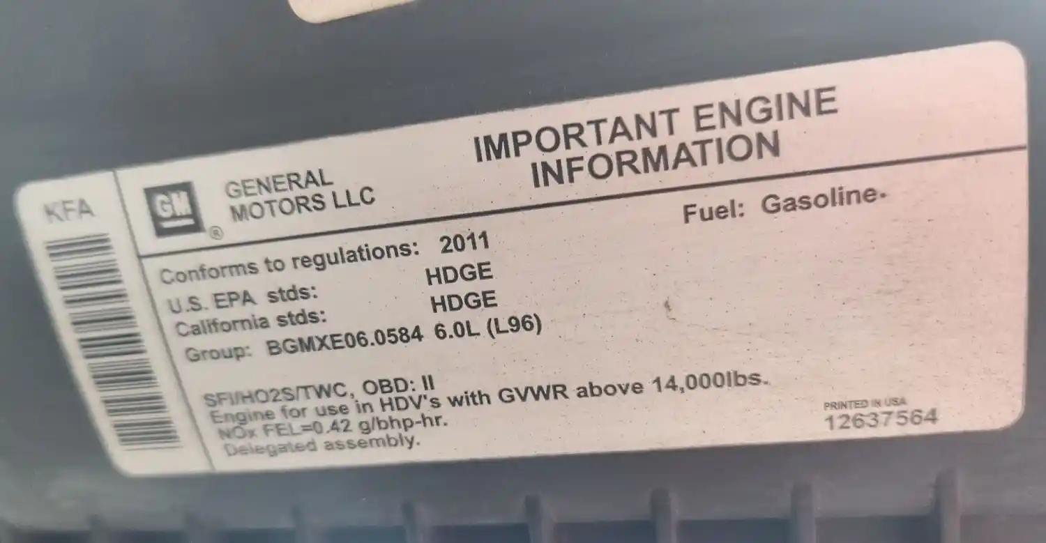 (Used) 2011 GM/Chev (HD) 6.0L, ENGINE ASSEMBLY- Family Number: BGMXE06.0584, Displacement: 6.0L, Horsepower: 360, Serial Number: TBD, ECS: SFI, HO2S, TWC, Fuel: Gasoline,