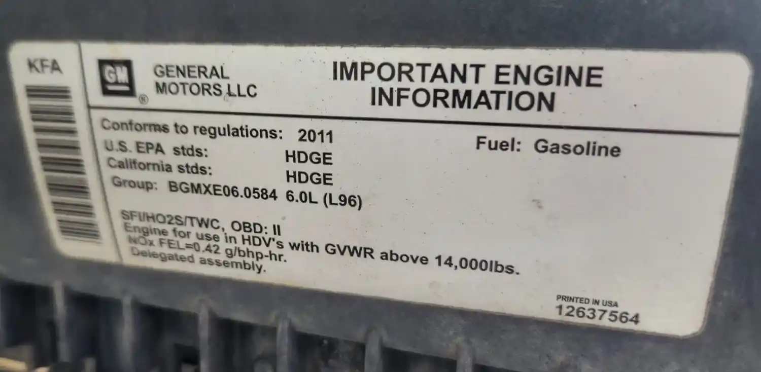 (Used) 2011 GM/Chev (HD) 6.0L, ENGINE ASSEMBLY- Family Number: BGMXE06.0584, Displacement: 6.0L, Horsepower: 360, Serial Number: TBD, E.C.S: SFI, HO2S, TWC, Fuel: Gasoline, Reference images for condition
