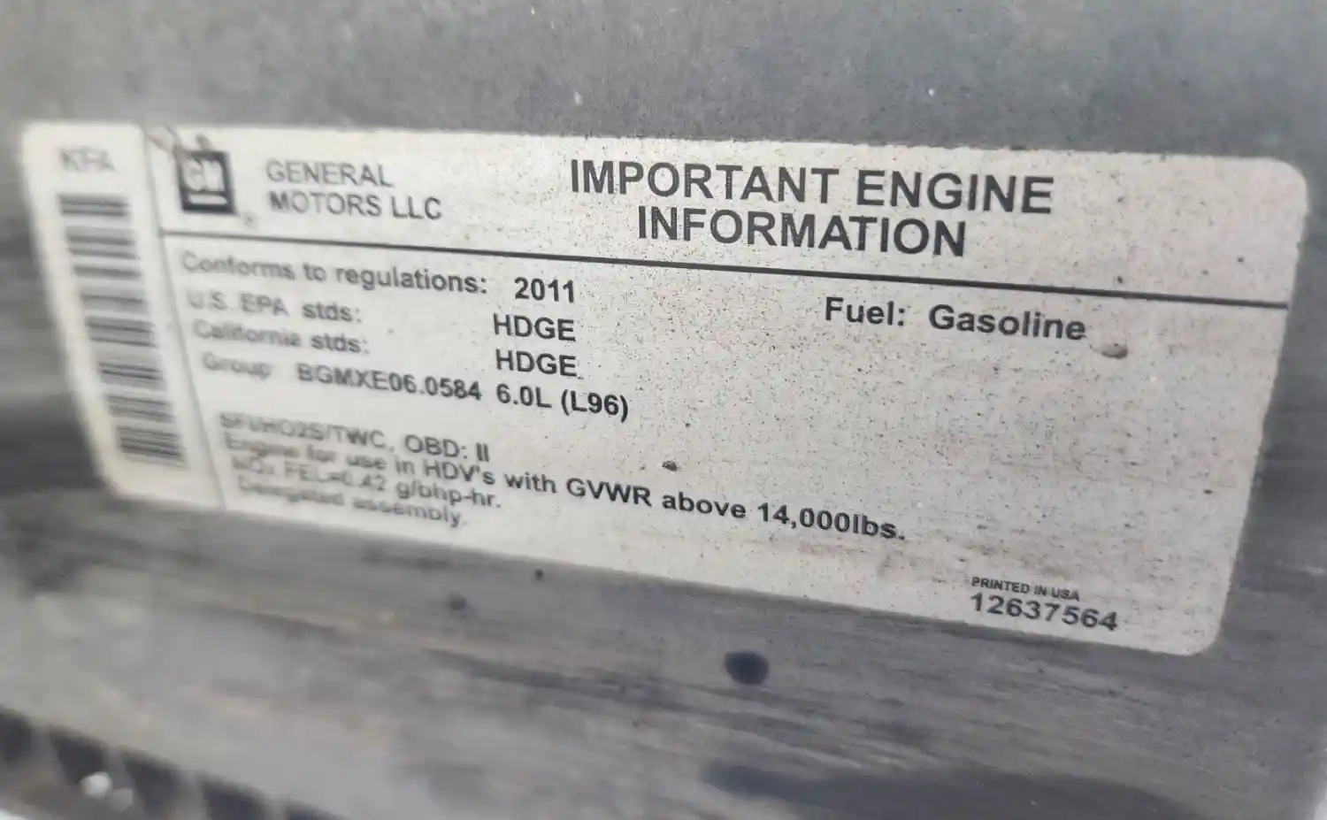 (Used) 2011 GM/Chev (HD) 6.0L, ENGINE ASSEMBLY- Family Number: BGMXE06.0584, Displacement: 6.0L, Horsepower: 360, Serial Number: TBD, E.C.S: SFI, HO2S, TWC,
