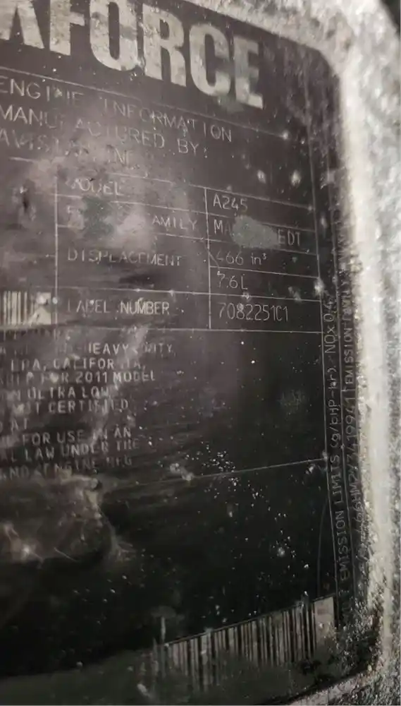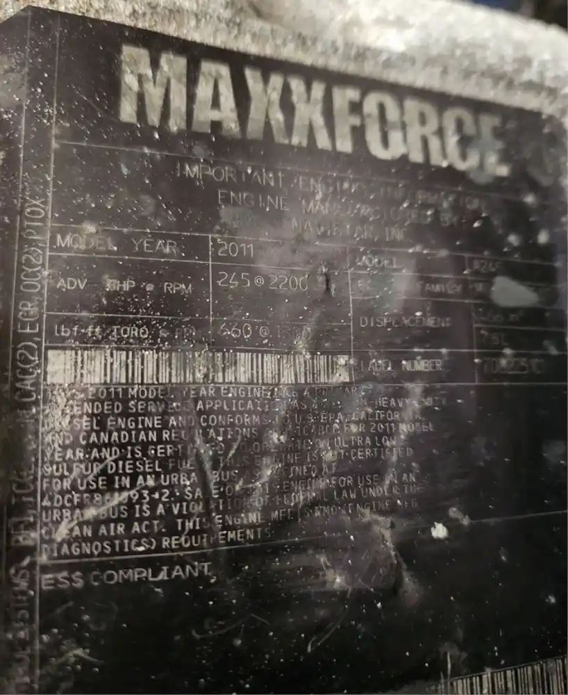 (Used) 2011 International A245, ENGINE ASSEMBLY- Family Number: MAXXFORCE DT, Displacement: 7.6L, Horsepower: 245, Serial Number: 466HM2Y3419941, Part Number: 7082251C1, E.C.S: DFI, TC(2), ECM, CAC (2), EGR, OC (2), PTOX,
